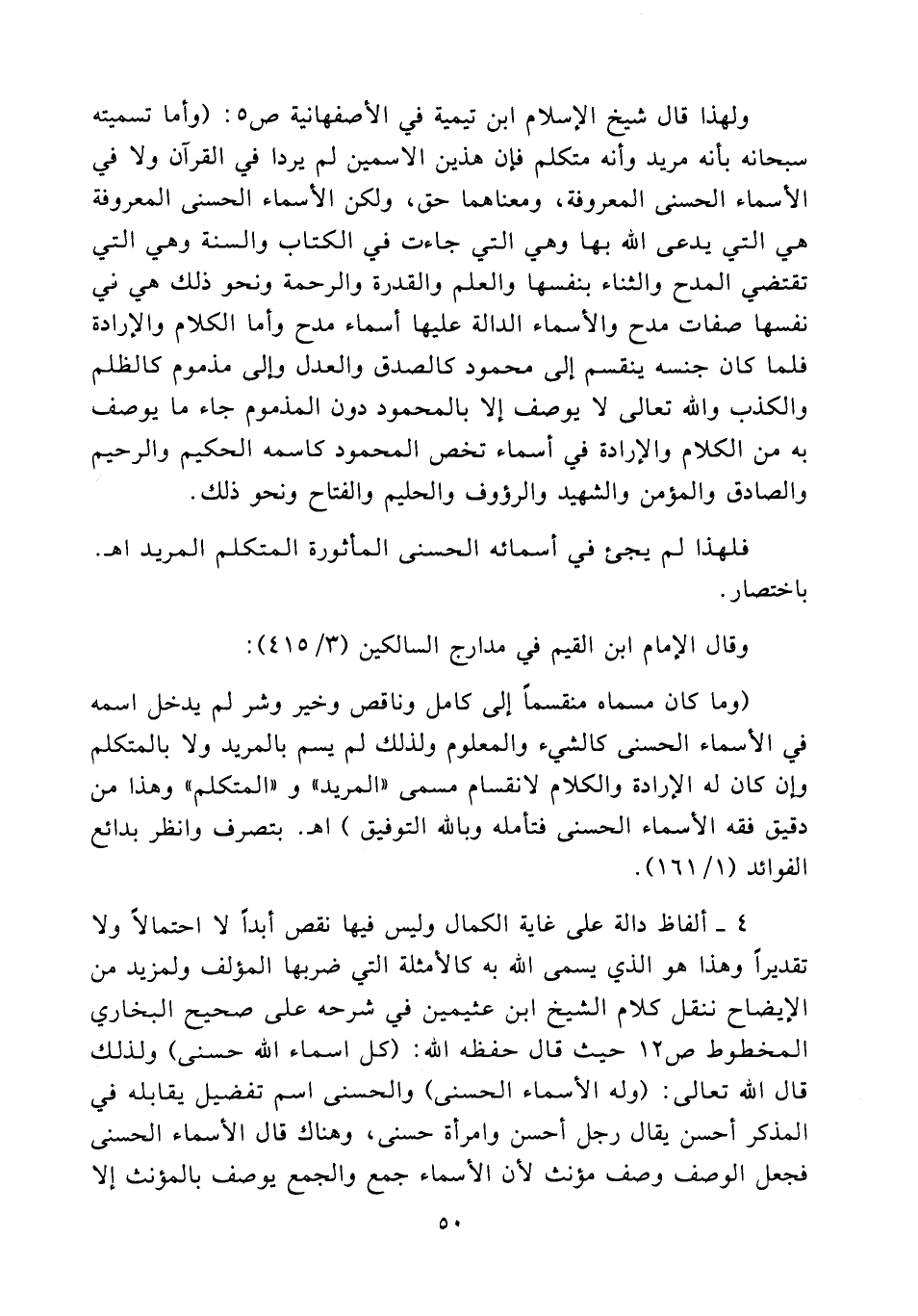 ولهذا قال شيخ الإسلام ابن تيمية في الأصفهانية ص 5: (وأما تسميته سبحانه بأنه مريد وأنه متكلم فإن هذين الاسمين لم يردا في القرآن ولا في الأسماء الحسنى المعروفة، ومعناهما حق، ولكن الأسماء الحسنى المعروفة هى التي يدعى الله بها وهي التي جاءت في الكتاب والسنة وهي التي تقتضي المدح والثناء بنفسها والعلم والقدرة والرحمة ونحو ذلك هي في نفسها صفات مدح والأسماء الدالة عليها أسماء مدح وأما الكلام والإرادة فلما كان جنسه ينقسم إلى محمود كالصدق والعدل وإلى مذموم كالظلم والكذب والله تعالى لا يوصف إلا بالمحمود دون المذموم جاء ما يوصف به من الكلام والإرادة في أسماء تخص المحمود كاسمه الحكيم والرحيم والصادق والمؤمن والشهيد والرؤوف والحليم والفتاح ونحو ذلك.