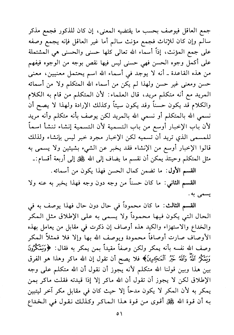 جمع العاقل فيوصف بحسب ما يقتضيه المعنى، إن كان للذكور فجمع مذكر سالم وإن كان للإناث فجمع مؤنث سالم أما غير العاقل فإنه يجمع وصفه على جمع المؤنث، إذاً أسماء الله تعالى كلها حسنى والحسنى هي المشتملة على أكمل وجوه الحسن فهي حسنى ليس فيها نقص بوجه من الوجوه فيفهم من هذه القاعدة - أنه لا يوجد في أسماء الله اسم يحتمل معنيين، معنى حسن ومعنى غير حسن ولهذا لم يكن من أسماء الله المتكلم ولا من أسمائه المريد مع أنه متكلم مريد، قال العلماء: لأن المتكلم من قام به الكلام والكلام قد يكون حسناً وقد يكون سيئاً وكذلك الإرادة ولهذا لا يصح أن نسمى الله بالمتكلم أو نسمى الله بالمريد لكن يوصف بأنه متكلم وأنه مريد لأن باب الإخبار أوسع من باب التسمية لأن التسمية إنشاء تنشأ اسما للمسمى الذي تريد أن تسميه لكن الإخبار مجرد خبر ليس بإنشاء ولذلك قالوا الإخبار أوسع من الإنشاء فقد يخبر عن الشيء بشيئين ولا يسمى به مثل المتكلم وحينئذ يمكن أن نقسم ما يضاف إلى الله عز وجل إلى أربعة أقسام: -