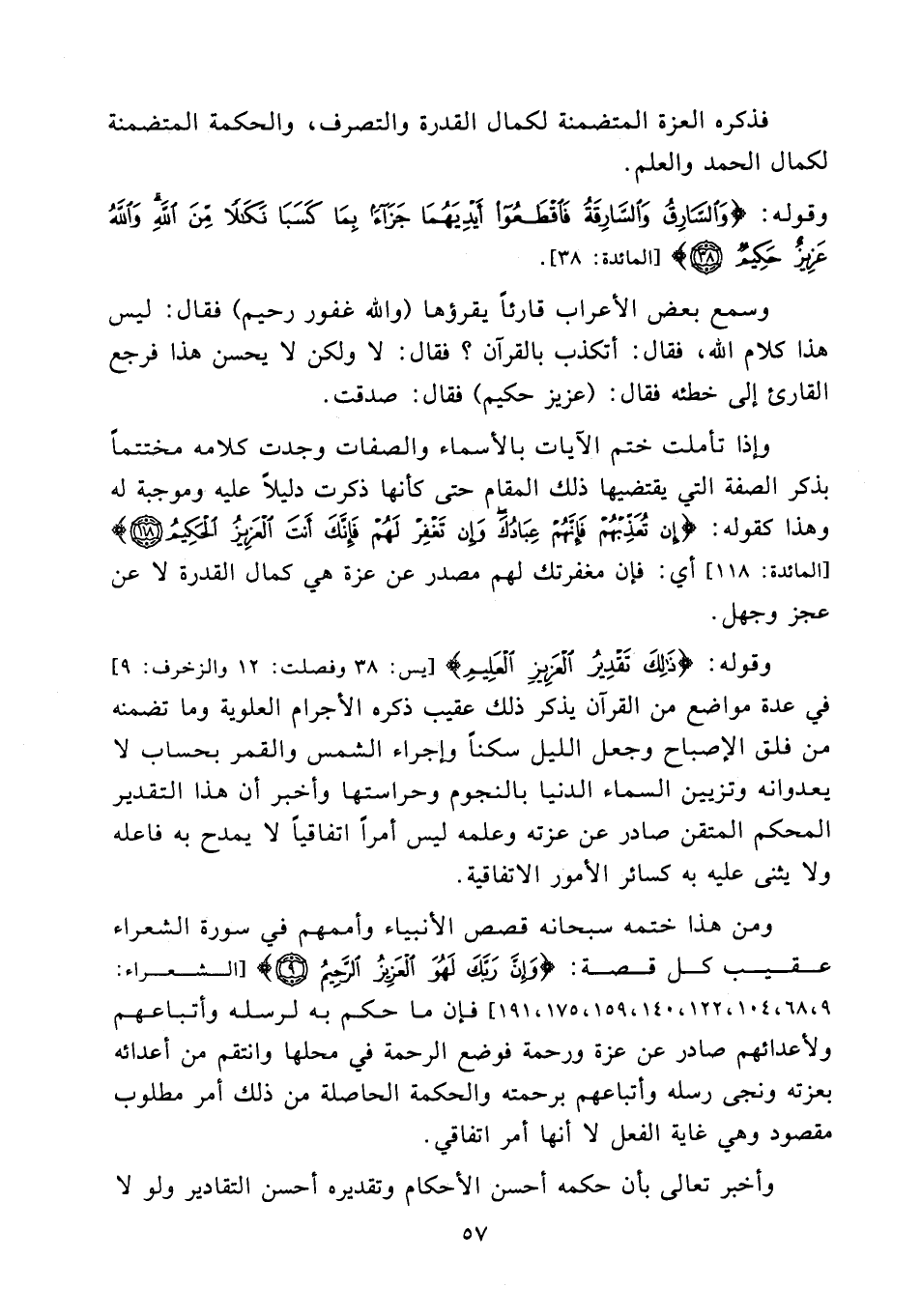 ومن هذا ختمه سبحانه قصص الأنبياء وأممهم في سورة الشعراء عقيب كل قصة: (وإن ربك لهو العزيز الرحيم) [الشعراء: 9، 68، 104، 122، 140، 159، 175، 191] فإن ما حكم به لرسله وأتباعهم ولأعدائهم صادر عن عزة ورحمة فوضع الرحمة في محلها وانتقم من أعدائه بعزته ونجى رسله وأتباعهم برحمته والحكمة الحاصلة من ذلك أمر مطلوب مقصود وهي غاية الفعل لا أنها أمر اتفاقي.