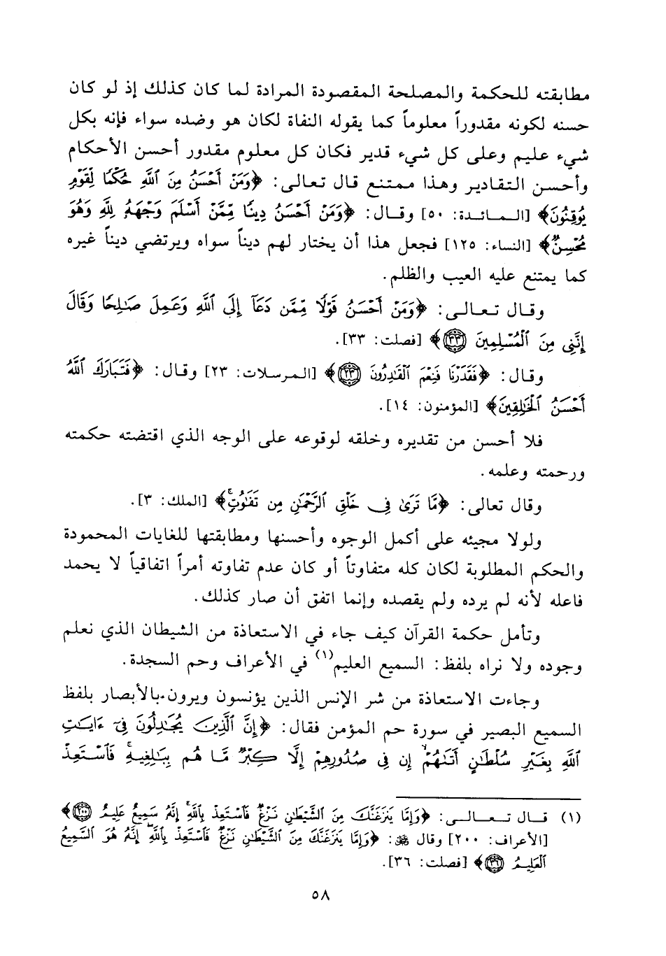 مطابقته للحكمة والمصلحة المقصودة المرادة لما كان كذلك إذ لو كان حسنه لكونه مقدوراً معلوماً كما يقوله النفاة لكان هو وضده سواء فإنه بكل شيء عليم وعلى كل شيء قدير فكان كل معلوم مقدور أحسن الأحكام وأحسن التقادير وهذا ممتنع قال تعالى: (ومن أحسن من الله حكماً لقوم يوقنون) [المائدة: 50] وقال: (ومن أحسن ديناً ممن أسلم وجهه لله وهو محسن) [النساء: 125] فجعل هذا أن يختار لهم ديناً سواه ويرتضي ديناً غيره كما يمتنع عليه العيب والظلم.