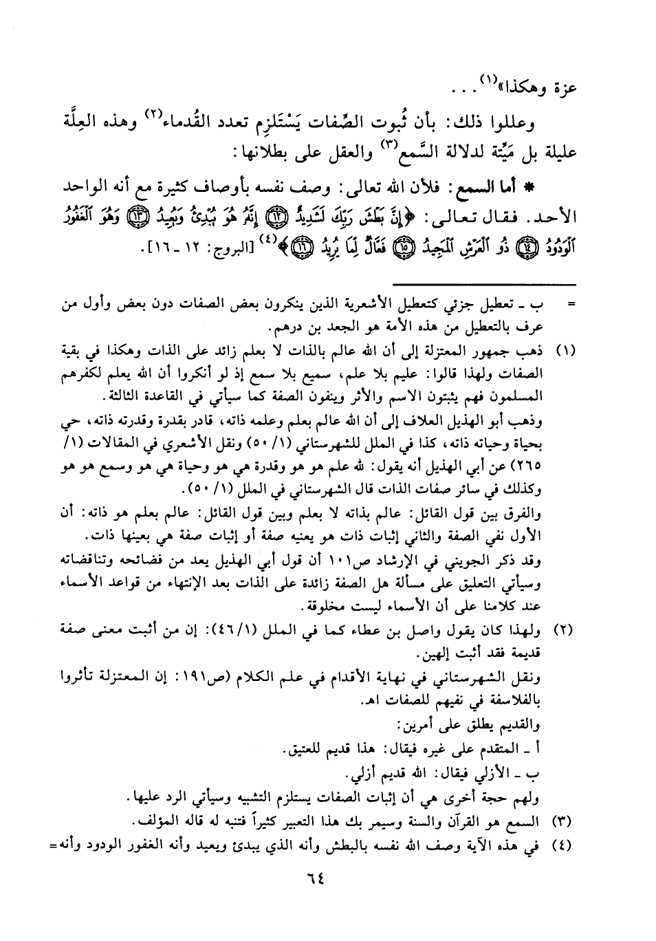وعللوا ذلك بأن ثبوت الصفات يستلزم تعدد القدماء (¬2) وهذه العلة عليلة بل ميتة لدلالة السمع (¬3) والعقل على بطلانها.