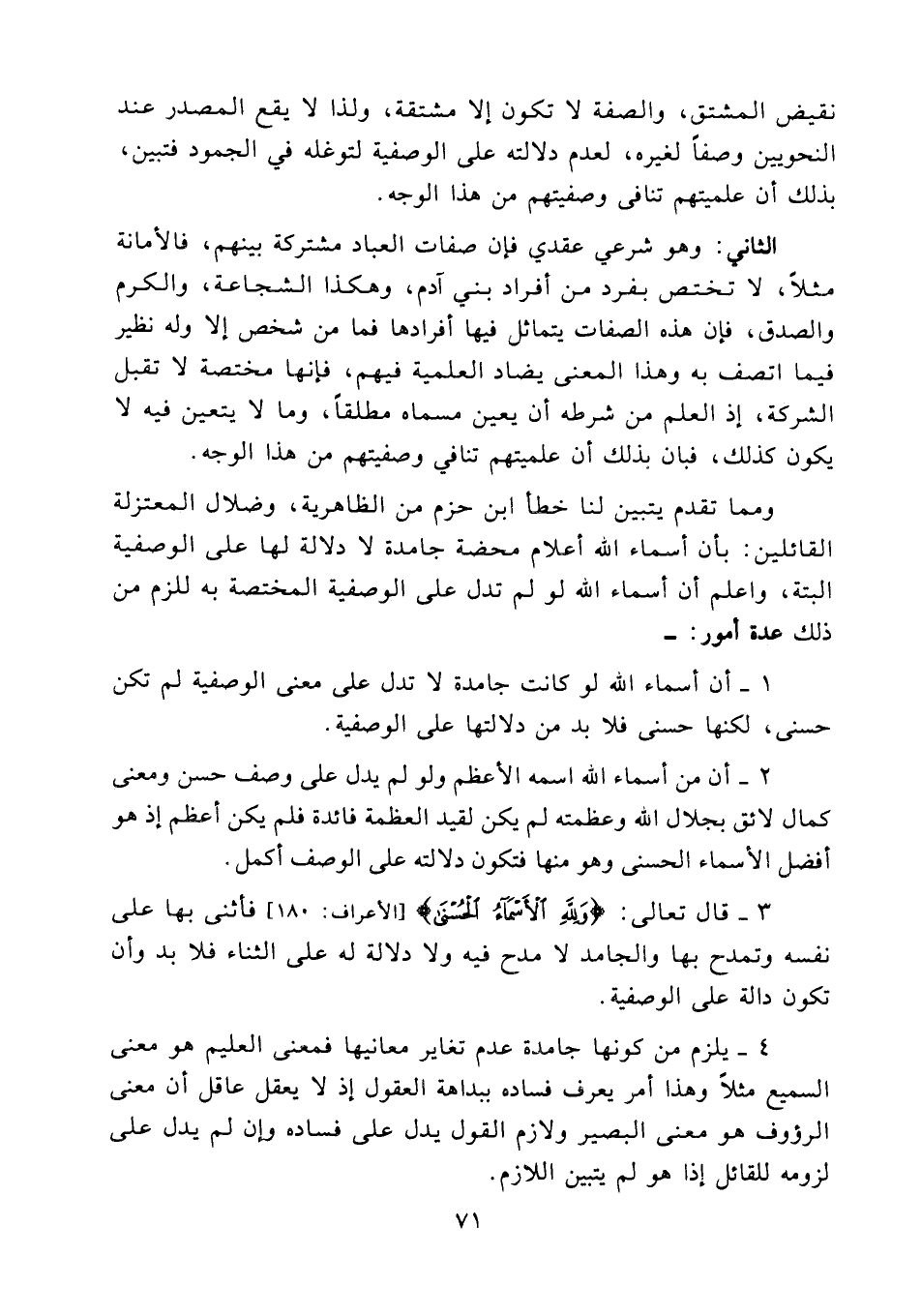 الثاني: وهو شرعي عقدي فإن صفات العباد مشتركة بينهم فالأمانة مثلاً لا تختص بفرد من أفراد بنى آدم وهكذا الشجاعة والكرم والصدق فإن هذه الصفات يتماثل فيها أفرادها فما من شخص إلا وله نظير فيما اتصف به وهذا المعنى يضاد العلمية فيهم فإنها مختصة لا تقبل الشركة إذ العلم من شرطه أن يعين مسماه مطلقاً وما لا يتعين فيه لا يكون كذلك فبان بذلك أن علميتهم تنافي وصفيتهم من هذا الوجه.
