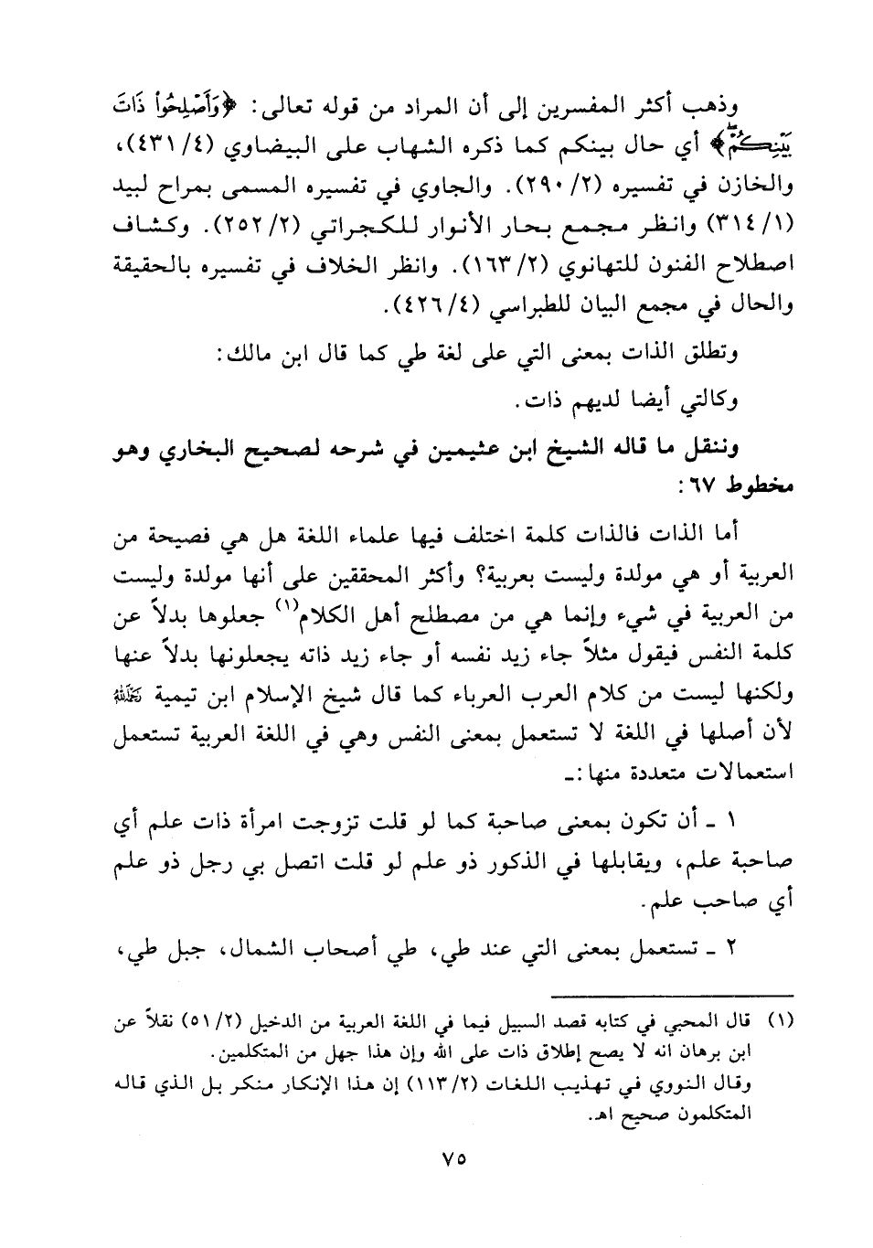 (¬1) قال المحبي في كتابه قصد السبيل فيما في اللغة العربية من الدخيل (2/51) نقلاً عن ابن برهان انه لا يصح إطلاق ذات على الله وان هذا جهل من المتكلمين.
