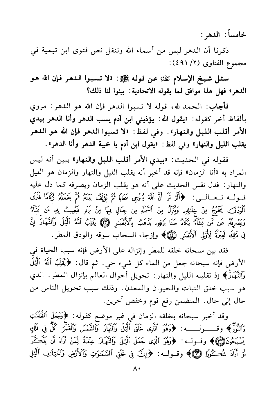 فقوله في الحديث " بيدي الأمر أقلب الليل والنهار " يبين أنه ليس المراد به أنا الزمان فإنه قد أخبر أنه يقلب الليل والنهار والزمان هو الليل والنهار: فدل نفس الحديث على أنه هو يقلب الزمان ويصرفه كما دل عليه قوله تعالى: (ألم تر أن الله يزجي سحاباً ثم يؤلف بينه ثم يجعله ركاماً فترى الودق يخرج من خلاله وينزل من السماء من جبال فيها من برد فيصيب به من يشاء ويصرفه عمن يشاء يكاد سنا برقه يذهب بالأبصار، يقلب الله الليل والنهار، إن في ذلك لعبرة لأولى الأبصار) وإزجاء السحاب سوقه والودق المطر.