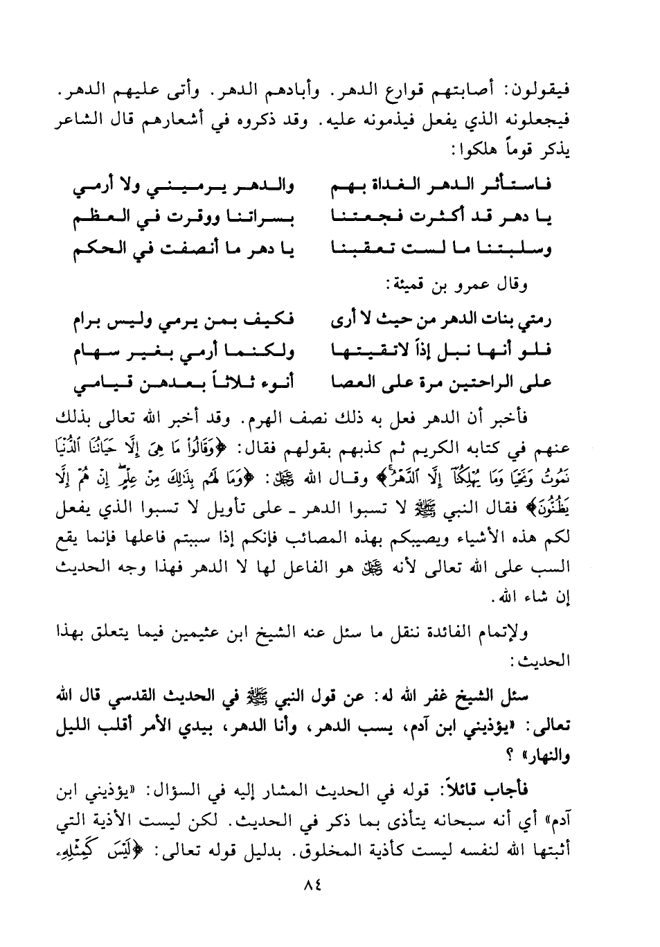 فيقولون: أصابتهم قوارع الدهر، وأبادهم الدهر، وأتى عليهم الدهر، فيجعلونه الذي يفعل فيذمونه عليه، وقد ذكروه في أشعارهم قال الشاعر يذكر قوماً هلكوا: