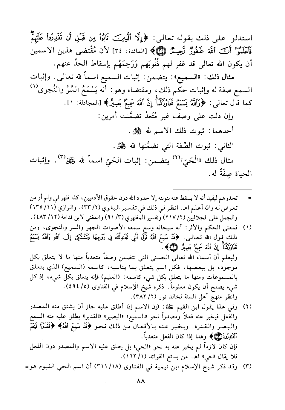 مثال ذلك " الحي " (¬2) يتضمن إثبات الحي اسماً لله عز وجل (¬3) وإثبات الحياة صفة له.