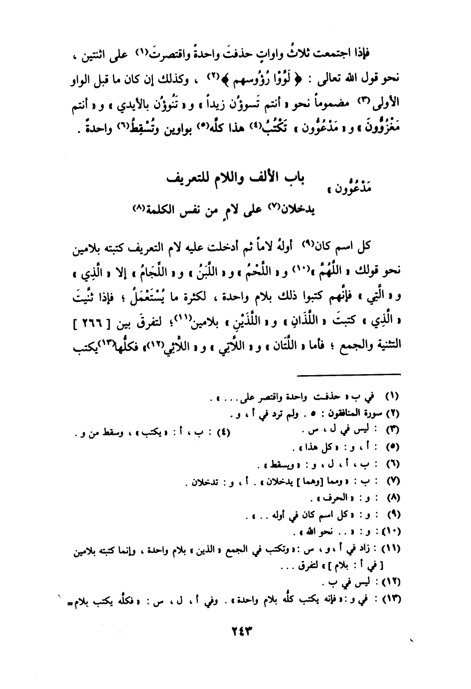 كل اسم كان أوله لاماً ثم أدخلت عليه لام التعريف كتبته بلامين نحو قولك " اللَّهمَّ " و " اللَّحم " و " اللَّبن " و " اللّجام " إلا " الَّذي " و " الَّتي " فإنهم كتبوا ذلك بلام واحدة، لكثرة ما يستعمل؛ فإذا ثنَّيت " الَّذي " كتبت " اللَّذان " و " اللَّذين " بلامين؛ لتفرق بين التثنية والجمع؛ فأما " اللَّتان " و " اللاَّتي " و " الَّلائي " فكلُّها يكتب