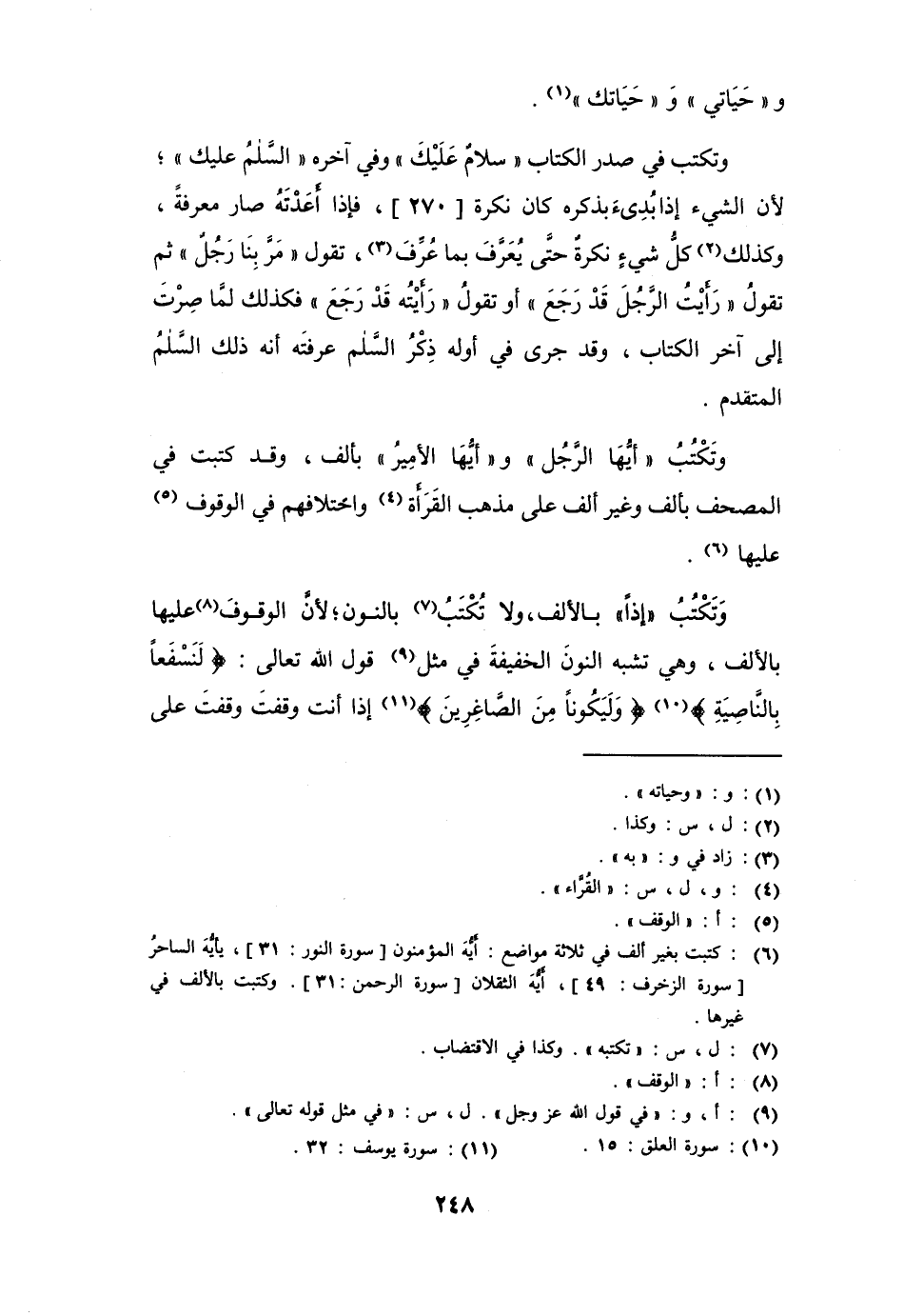 وتكتب في صدر الكتاب " سَلمٌ عليكَ " وفي آخره " السَّلمُ عليك "؛ لأن الشيء إذا بديء بذكره كان نكرة، فإذا أعدته صار معرفة، وكذا كل شيء نكرة حتى يُعرَّف بما عُرِّف، تقول " مرَّ بنا رَجل " ثم تقول " رأيتُ الرَّجل قد رَجَعَ " أو تقول " رأيتُهُ قد رَجَعَ " فكذلك لما صرت إلى آخر الكتاب، وقد جرى في أوله ذِكر السلام عرفته أنه ذلك السلام المتقدم.