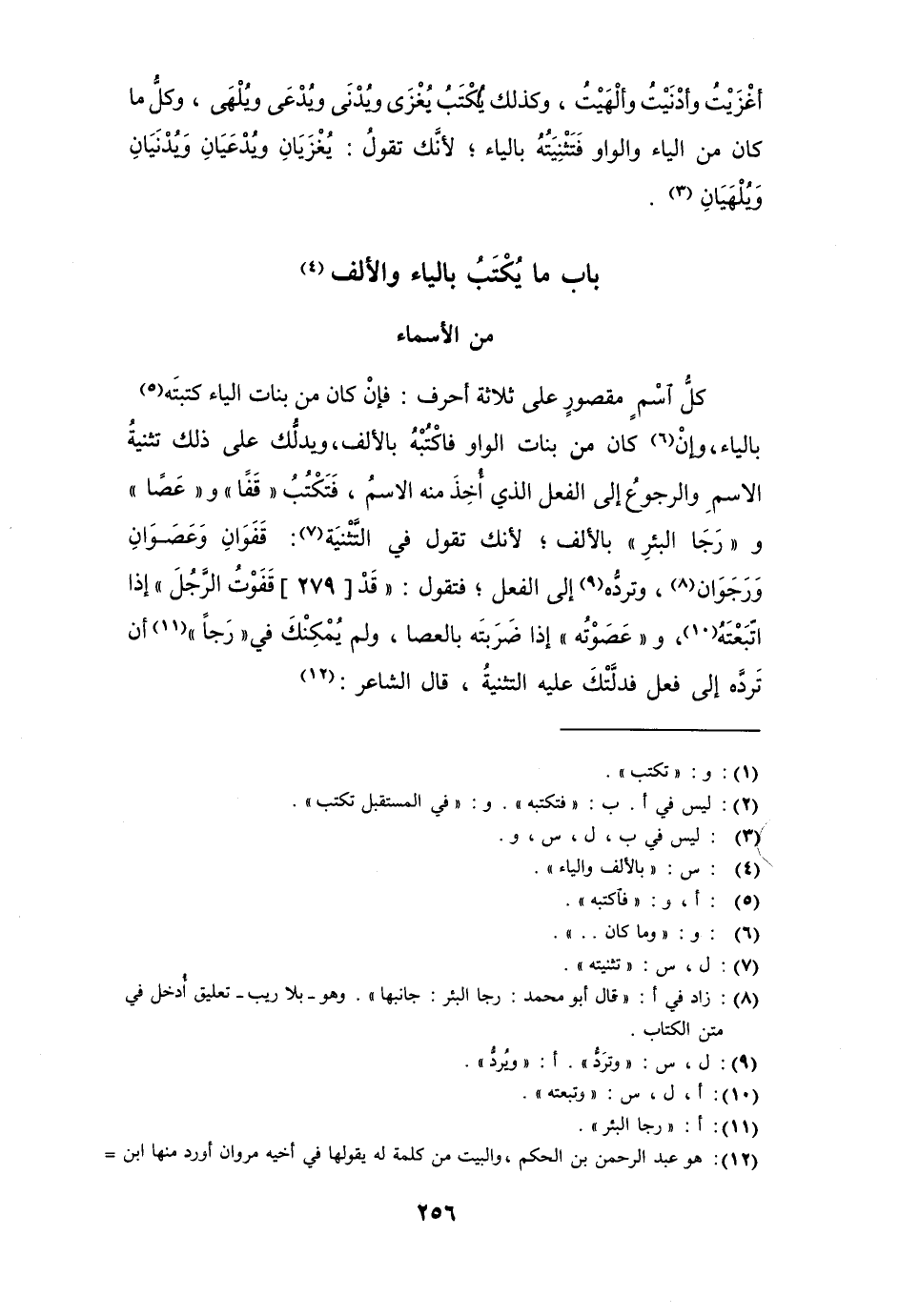 كل اسم مقصور على ثلاثة أحرف: فإن كان من بنات الياء كتبته بالياء، وإن كان من بنات الواو فاكتبه بالألف، ويدلك على ذلك تثنية الاسم والرجوع إلى الفعل الذي أخذ منه الاسم، فتكتب " قَفاً " و " عَصاً " و " رَجَا البئرِ " بالألف؛ لأنك تقول في تثنيته: قَفَوَان وعَصَوَان ورَجَوَان، وترد إلى الفعل؛ فتقول " قد قَفَوْت الرَّجل " إذا اتبعته، و " عَصَوْتُه " إذا ضربته بالعصا، ولم يمكنك في " رَجَا " أن ترده إلى فعل فدلَّتك عليه التثنية، قال الشاعر: