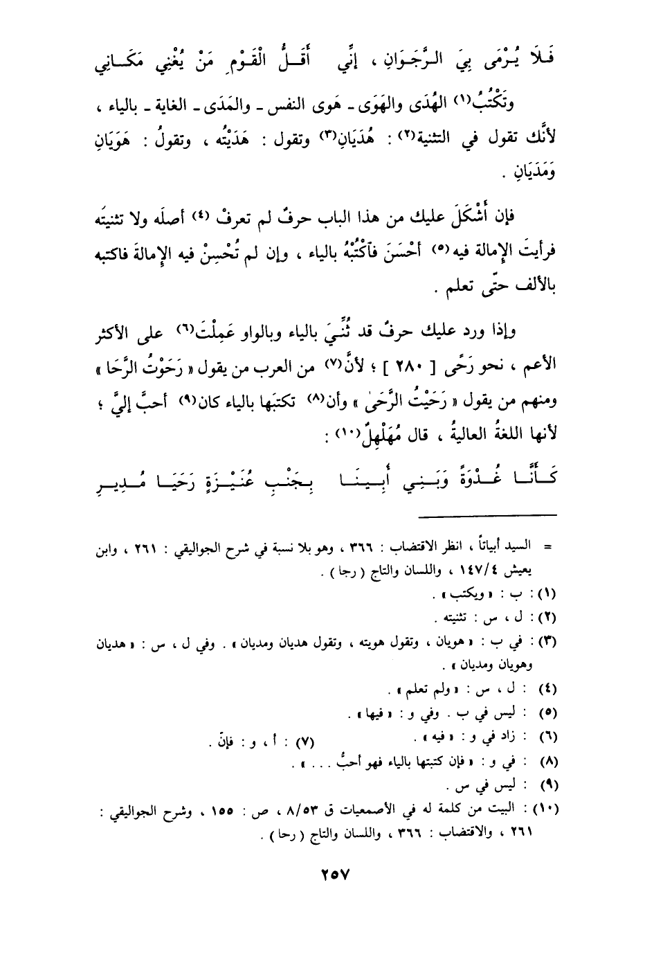 وإذا ورد عليك حرف قد ثُنِّي بالياء وبالواو عملت على الأكثر الأعم، نحو رَحَى؛ لأن من العرب من يقول " رَحَوْت الرَّحَا " ومنهم من يقول " رَحَيْت الرَّحَى " وأن تكتبها بالياء كان أحبُّ إليَّ؛ لأنها اللغة العالية، قال مُهلهلٌ: