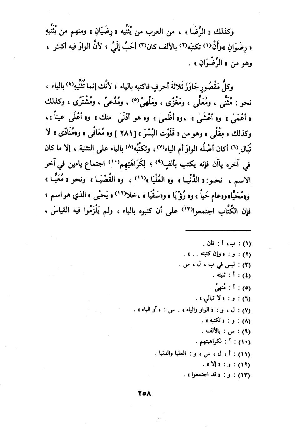 وكذلك " الرِّضا " من العرب من يثنيه " رِضَيَان " ومنهم من يثنيه " رِضَوَان " وأن تكتبه بالألف أحبُّ إليَّ؛ لأن الواو فيه أكثر، وهو من " الرِّضوان ".