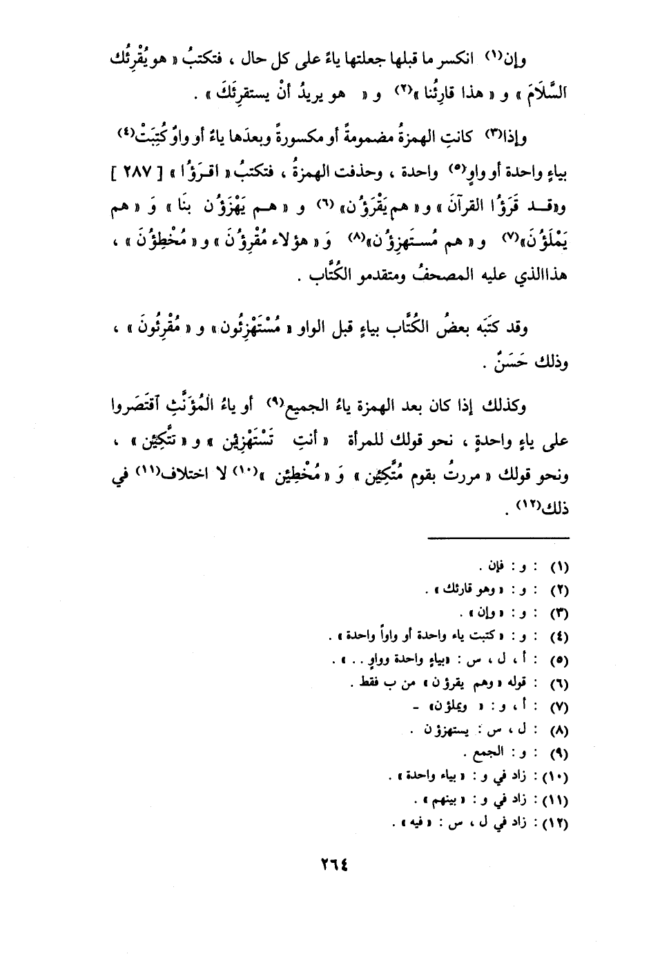 وإذا كانت الهمزة مضمومة أو مكسورة وبعدها ياء أو واو كتبت بياء واحدة أو واو واحدة، وحذفت الهمزة، فتكتب " اقرَؤُا " و " قد قَرَؤُا القرآن " و " هم يقرُؤُن " و " وهم يَهْزَؤن بنا " و " هم يَمْلَؤن " و " هم مُسْتَهزِؤُن " و " هؤلاء مُقْرِؤُن " و " مُخْطِؤُن "، هذا الذي عليه المصحف ومتقدمو الكتاب.