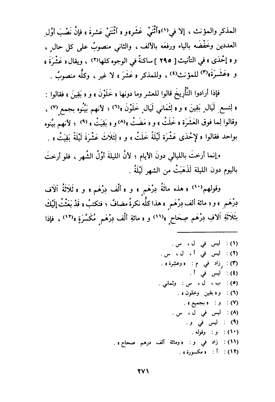 فإذا أرادوا التأريخ قالوا للعشر وما دونها " خَلَوْنَ " و " بَقِينَ " فقالوا: " لتسعٍ ليالٍ بَقينَ " و " ثَمني ليالٍ خَلَوْن " " مضت " و " بقيت "، لأنهم بيَّنوه بجمع، وقالوا لما فوق العشرة " خلت " ولأنهم بينوه بواحد فقالوا " لإحدى عَشْرَةَ ليلةً خَلَتْ " و " لثَلاثَ عَشْرَةَ لَيْلةً بَقِيَتْ ".