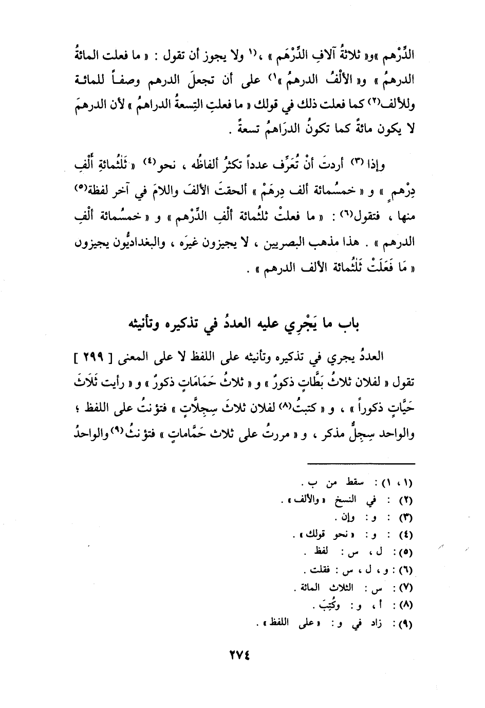 وإذا أردت أن تُعَرِّف عدداً تكثرُ ألفظاه، نحو " ثَلثُمائةِ ألْفِ دِرْهمٍ " " وخمسمائة ألف دِرْهمٍ " ألحقت الألف واللام في آخر لفظة منها، فقلت: " ما فعلت ثلثمائة ألْفِ الدِّرْهم " و " خمسمائة ألْف الدرهم ". هذا مذهب البصريين، لا يجيزون غيره، والبغداديون يجيزون " ما فَعَلَت ثلاث مائة الألف الدرهم ".