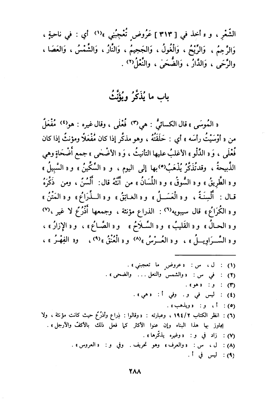 باب ما يذكر ويؤنث " المُوسى " قال الكسائي: هي فُعْلى، وقال غيره: هو مُفْعَل من " أُوْسَيْتُ رأسَه " أي: حَلَقْتُه، وهو مذكر إذا كان مُفْعَلاً ومؤنث إذا كان فُعْلى، و " الدَّلْو " الأغلبُ عليها التأنيث، و " الأضْحَى " جمع أضْحَاة وهي الذبيحة، وقد تُذَكَّر يُذْهَبُ بها إلى اليوم، و " السِّكِّين " و " السَّبيل " و " الطَّريق " و " السُّوق " و " اللِّسان " من أنَّثه قال: أَلْسُنٌ، ومن ذكره قال: أَلُسِنَةٌ، و " العَسَل " و " العاتِق " و " الذِّراع " و " المَتْن " و " الكُراع " قال سيبويه: الذراع مؤنثة، وجمعها أَذْرُعٌ لا غير، و " الحالُ " و " القَليب " و " السِّلاح " و " الصَّاع "، و " الإزار "، و " السَّراوِيل "، و " العُرْسُ " و " العُنُقُ "، و " الفِهْر "،