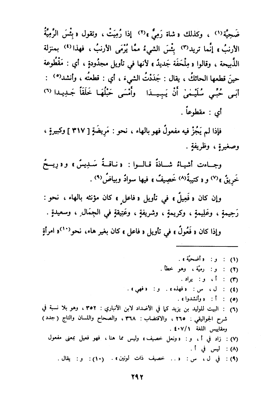 ضَحِيَّة، وكذلك " شاة رَمِيٌّ " إذا رُمِيَتْ، وتقول " بئس الرَّمِيَّة الأرنب " إنما تريد بئس الشيء مما يُرْمَى الأرنبُ، فهذا بمنزلة الذبيحة، وقالوا " مِلْحَفَة جَديدٌ " لأنها في تأويل مجدودة، أي: مَقطوعة حين قطعها الحائك، يقال: جَدَدْتُ الشيء، أي قطعته، وأنشد:
