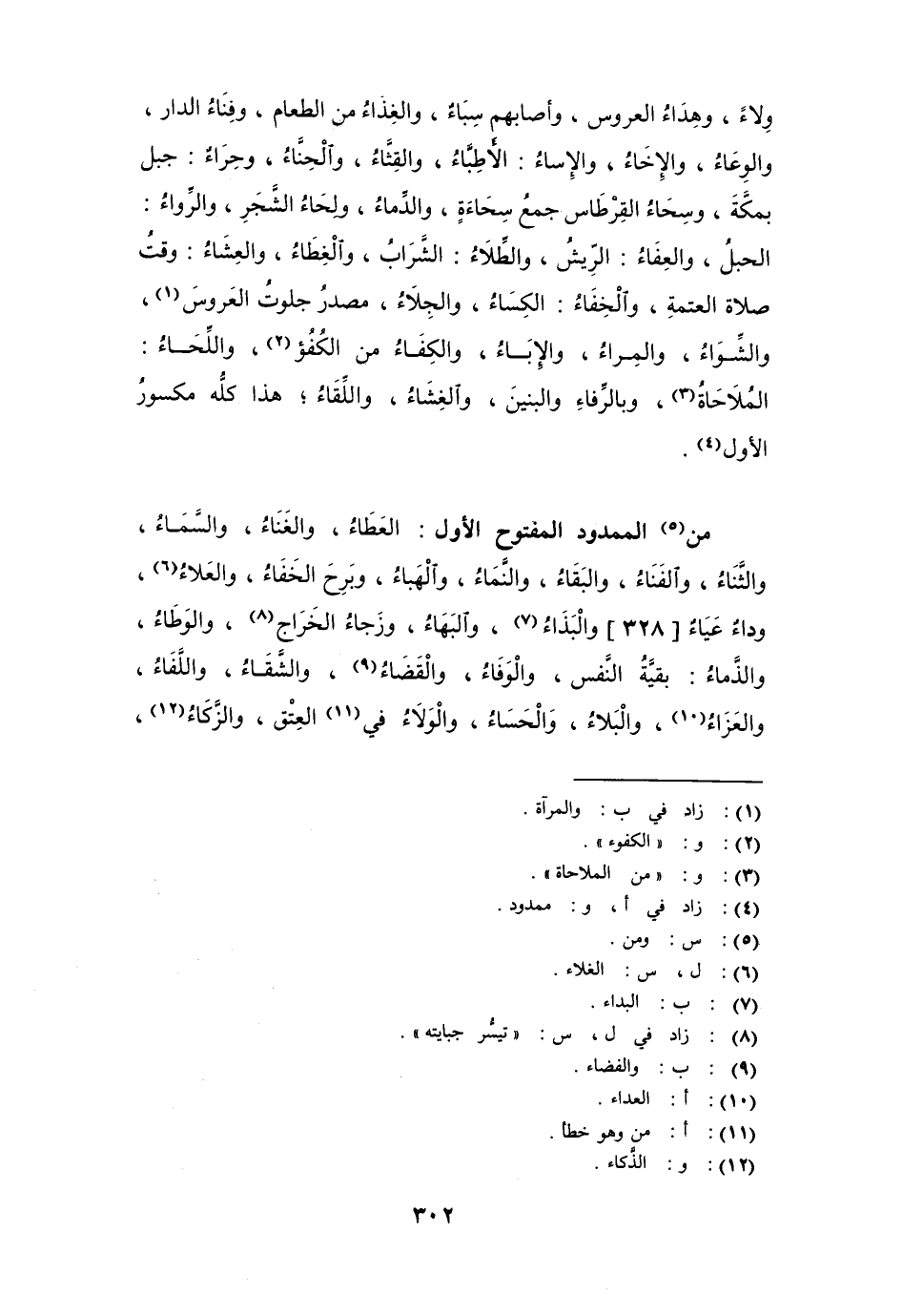 ومن الممدود المفتوح الأول: العَطاءُ، والغَنَاءُ، والسَّماءُ، والثَّناءُ، والفَناءُ، والبَقاءُ، والنَّماءُ، والهَباءُ، وبَرِحَ الخَفاءُ، والعَلاءُ، وداءٌ عَيَاءٌ والبَذاء، والبَهاء، وزَجاءُ الخراج: تَيَسُّر جِبايته، والوَطاء، والذَّماء: بقية النَّفْس، والوَفاءُ، والقَضاءُ، والشَّقاءُ، واللَّفاءُ، والعَزاءُ، والبَلاءُ، والحَساءُ، والوَلاء في العِتق، والزَّكاء،