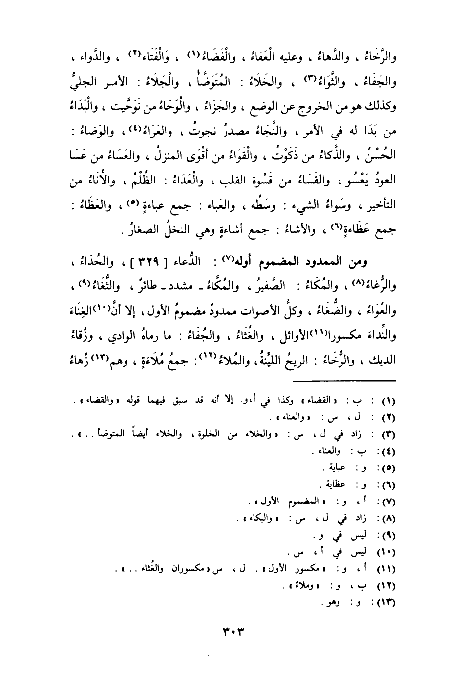 والرَّخاء، والدَّهاء، وعليه العَفاءُ، والفَضاءُ، والعَناءُ والفَتَاءُ، والدَّواء، والجَفاء، والثَّوَاءُ والخَلاء من الخَلوة والخَلاء أيضاً المُتَوَضَّأُ، والجَلاء: الأمر الجليّ وكذلك هو من الخروج عن الموضع، والجَزاء، والوَحاء من تَوَحَّيت، والبَداء من بدا له في الأمر، والنَّجاء مصدر نجوت، والعَراء، والوَضاء: الحُسْنُ، والذَّكاء من ذَكَوْتُ، والقَواء من أقْوَى المنزل، والعَساء من عَسا العود يَعْسُو، والقَساءُ من قسوة القلب، والعَداء: الظلم، والأناء من التأخير، وسواء الشيء: وسَطُه، والعَباء: جمع عباءة، والعَظاء: جمع عَظاءة، والأشاء: جمع أشاءة وهي النخل الصغار.