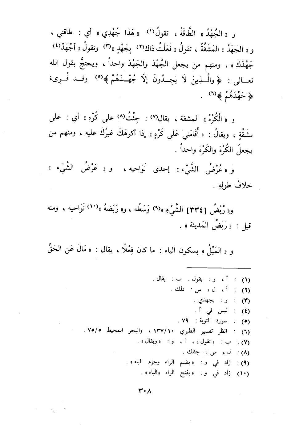 و " الجُهْدُ " الطاقة، تقول " هذا جُهْدي " أي: طاقتي، و " الجَهْد " المشقة، تقول " فَعَلْتُ ذلكَ بِجَهْدٍ " وتقول " اجْهَدْ جَهْدَكْ "، ومنهم من يجعل الجُهْدَ والجَهْدَ واحداً، ويحتج بقوله:) والَّذينَ لا يَجِدونَ إلا جُهْدَهُمْ (وقد قرئ) جَهْدَهم (.