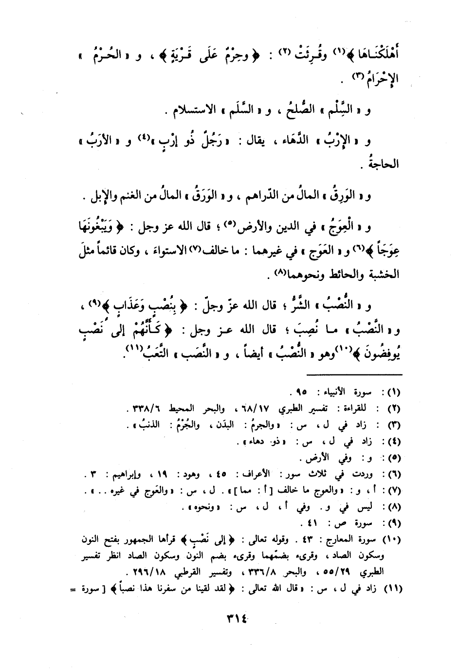 و" النُّصْب " الشر؛ قال الله عزّ وجلّ:) بِنُصْبٍ وعَذَاب (، و " النُّصُبُ " ما نُصِب؛ قال الله عزّ وجلّ:) كأنَّهُمْ إلى نُصُبٍ يوفِضون (وهو النُّصْب أيضاً، و " النَّصَب " التَّعَب