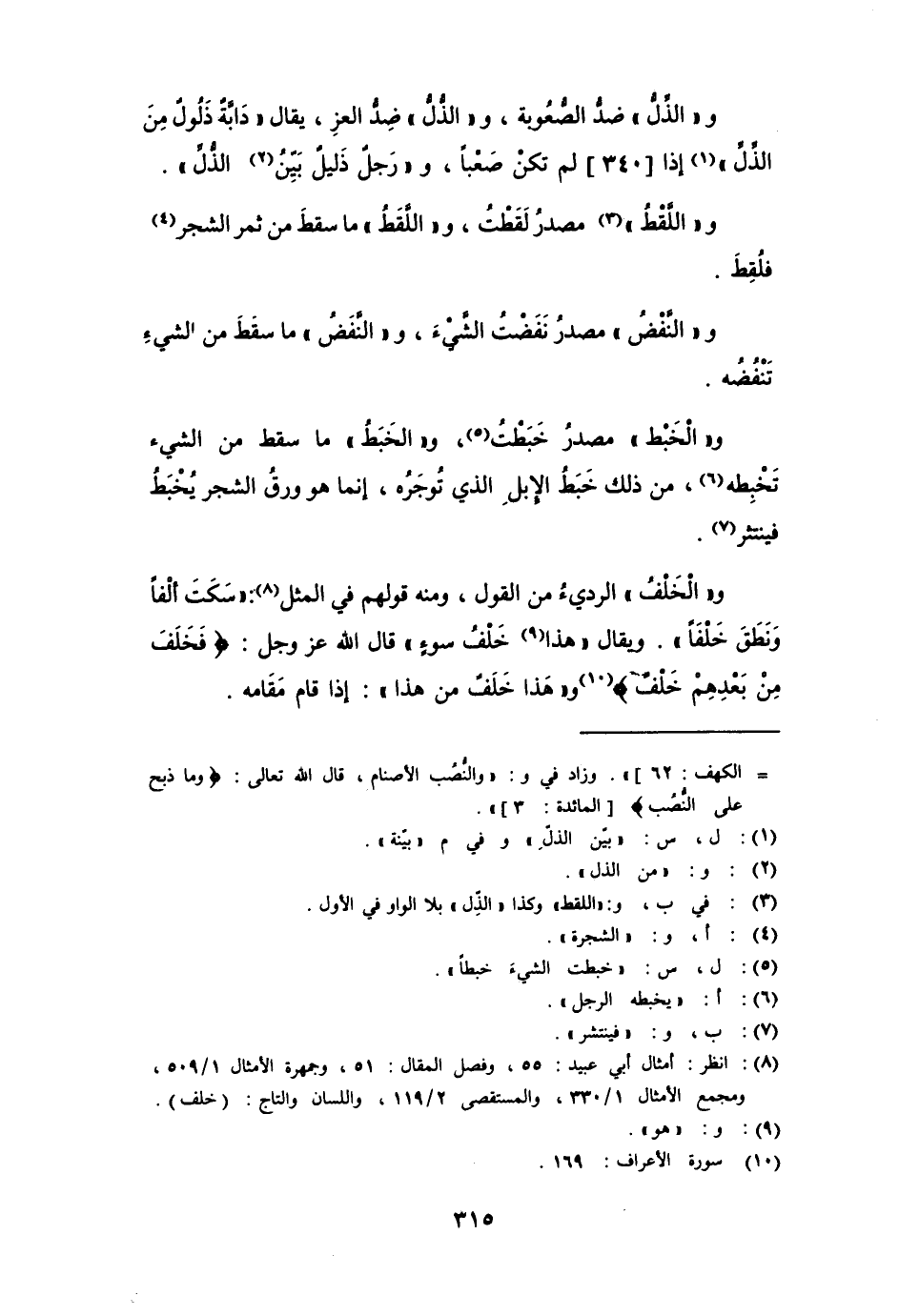و" الخَلْفُ " الرديء من القول، ومنه قولهم في المثل: " سَكَتَ أَلْفاً ونَطَقَ خَلْفاً ". ويقال " هذا خَلْفُ سوء " قال الله عزّ وجلّ:) فَخَلَفَ منْ بَعْدِهمْ خَلْف (و " هذا خَلَفٌ من هذا " إذا قام مَقَامه.