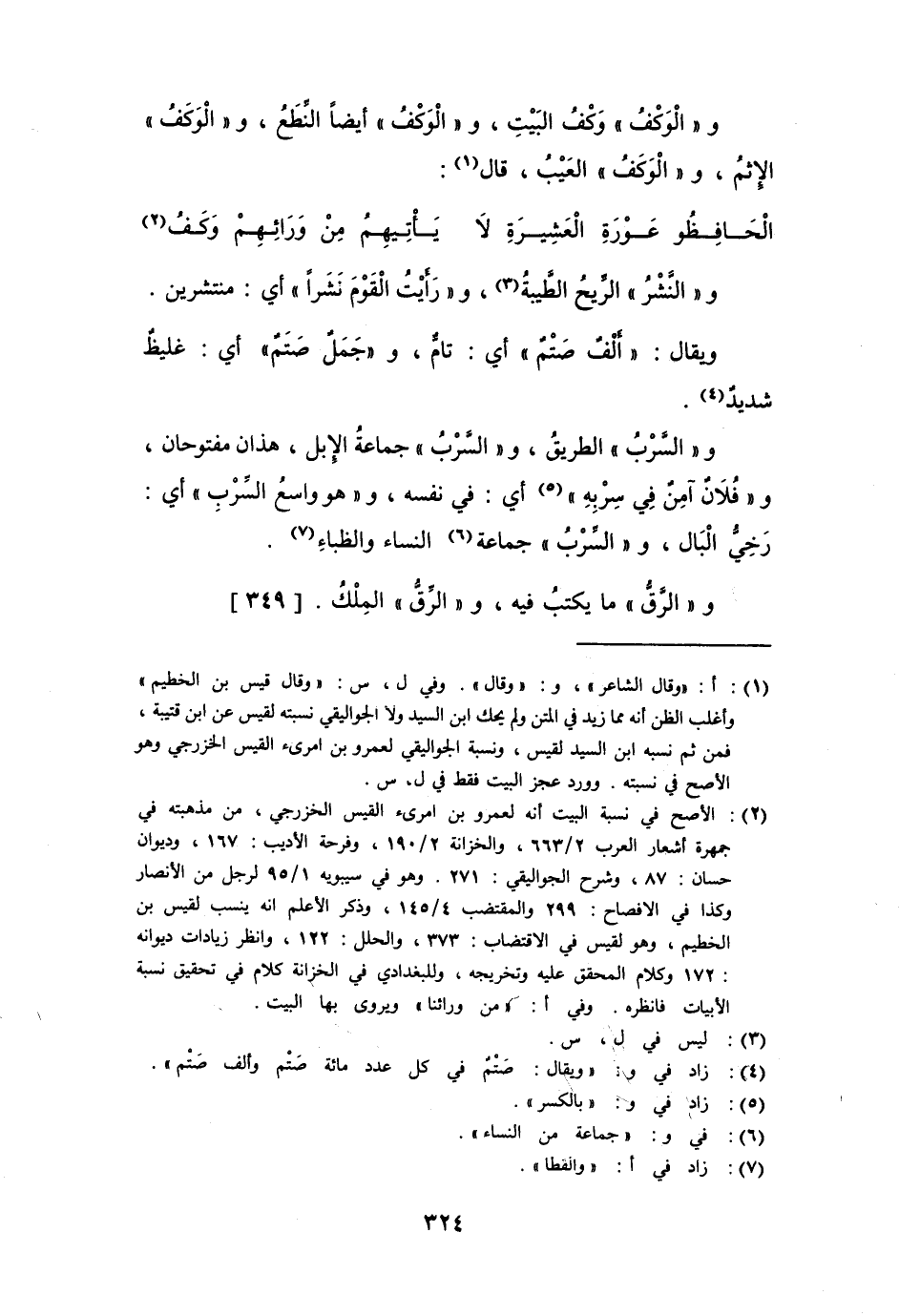 و " الوَكْف " وَكْف البَيْتِ، و " الوَكْفُ " أيضاً النِّطَعُ، و " الوَكَف " الإثم، و " الوَكَفُ " العَيْبُ، قال قيسُ بنُ الخطيم: