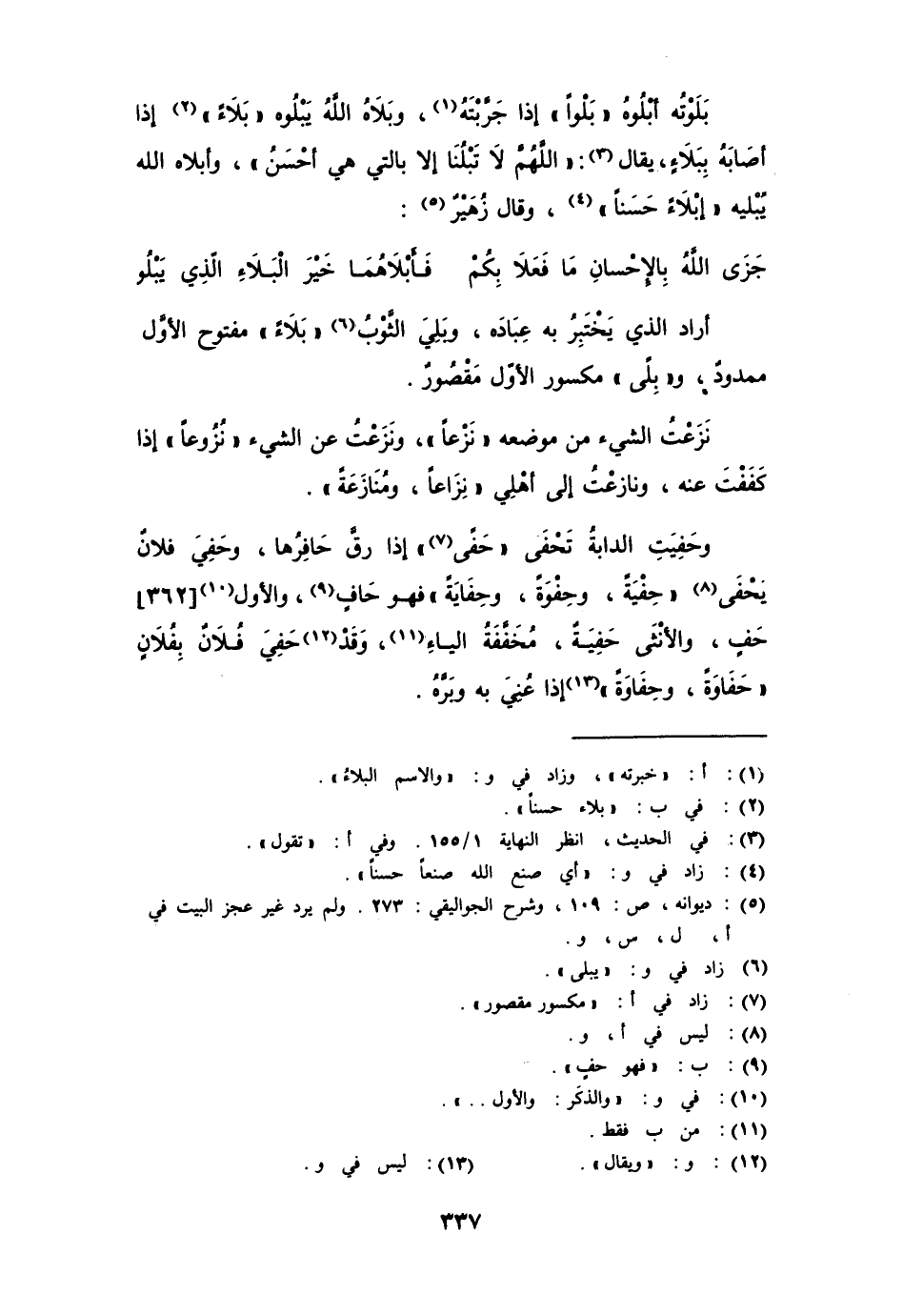 بَلَوْتُه أبلوه " بَلْواً " إذا جرَّبته، وبَلاه الله يَبْلوه " بَلاَءً " إذا أصابه بِبَلاءٍ، يقال: اللَّهمَّ لا تَبْلُنا إلا بالتي هي أحسنُ، وأبلاه الله يُبليه " إبْلاءً حَسَناً " إذا صنع به صنعاً جميلاً، وقال زهير: