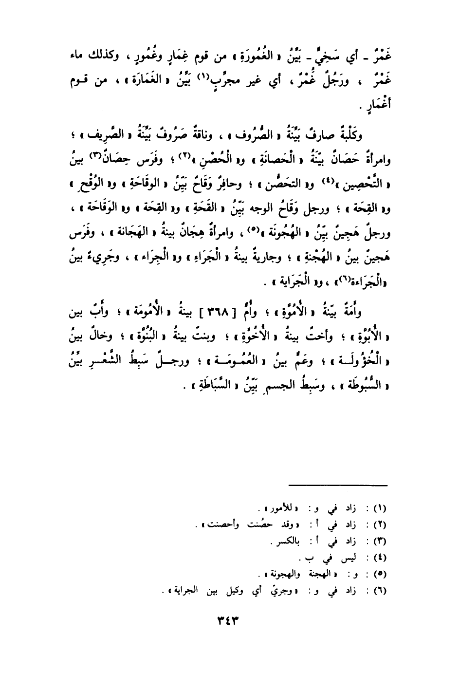 وكلبة صارفٌ بيِّنة الصُّرُوف، وناقة صَرُوفٌ بيِّنة الصَّريف؛ وامرأة حَصَانٌ بيِّنة الحَصَانَة، والحُصْنِ؛ وفرس حِصَانٌ بيِّن التَّحْصين، والتحَصُّن؛ وحافرٌ وَقَاحٌ بيِّن الوَقَاحَة، والوُقْحِ، والقِحَة؛ ورجل وَقَاحُ الوجه بيِّن القَحة، والقِحة، والوَقَاحَة، ورجل هَجِينٌ بيِّن الهُجُونة، وامرأةٌ هِجَانٌ بيِّنة الهَجَانة؛ وفرس هَجين بيِّن الهُجْنة؛ وجاريةٌ بيِّنة الجَرَاءِ، والجَرَاء، وجريءٌ بيِّن الجَرَاءة، والجَرَاية.
