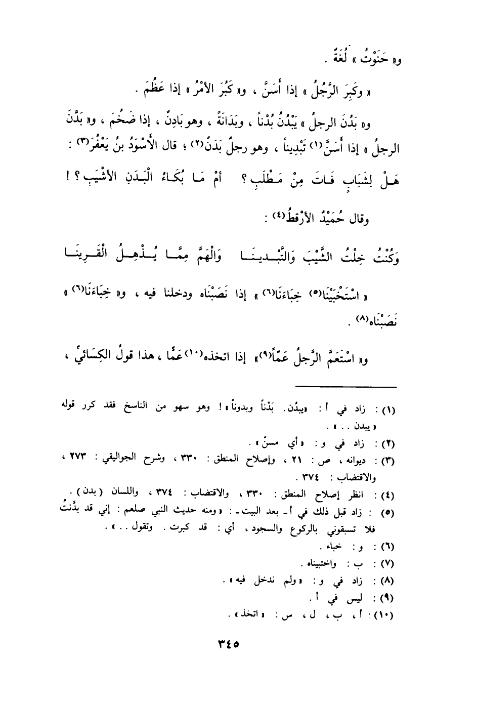 و" بَدُنَ الرجل " يَبْدُنُ بُدْناً وبَدَانةً، وهو بادِنٌ، إذا ضَخُمَ، و " بَدَّنَ الرجل " إذا أسَنَّ تَبْدِيناً، وهو رجلٌ بَدَنٌ؛ قال الأسْوَدُ بن يَعْفُر:
