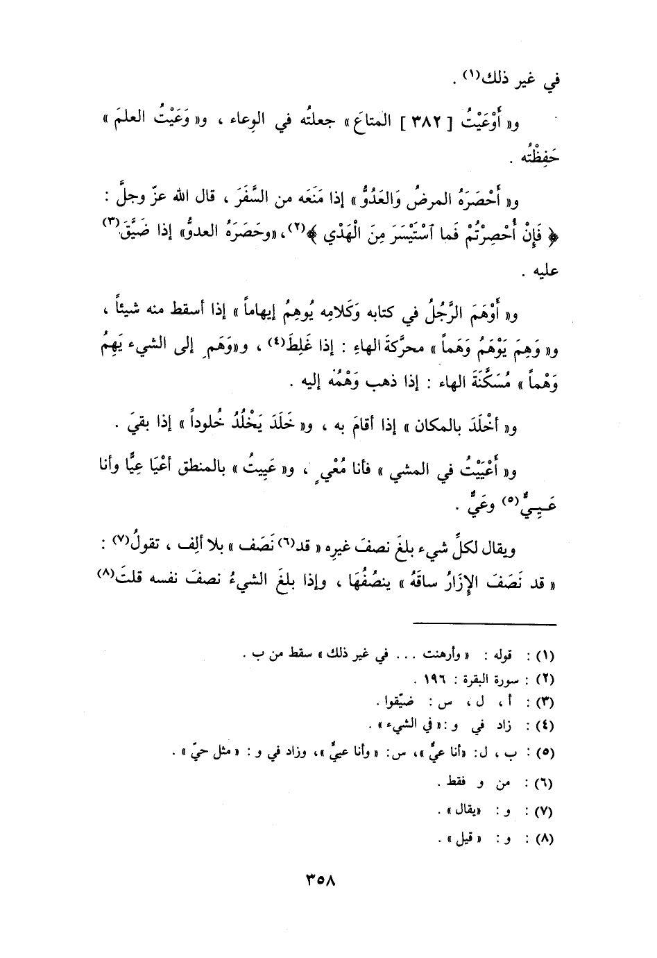 و" أوْهم الرجل في كتابه وكَلاَمِه يُوهِمُ إيهاماً " إذا أسقط منه شيئاً، و " وَهِمَ يَوْهِم وَهَماً " محركة الهاء - إذا غَلِطَ، و " وَهَم إلى الشيء يَهمُ وَهْماً " مسكنة الهاء - إذا ذهب وَهْمه إليه.