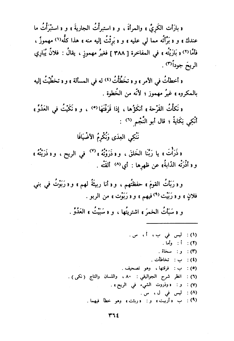 " بارَأت الكَرِيّ " والمرأة، و " استبرأْتُ الجارية " واستبرأْتُ ما عندك " و " برّأته مما لي عليه " و " بَرِئت إليه منه " هذا كله مهموز، فأما " بَارَيْتُه " في المفاخرة فغير مهموز، يقال: فلان يُبَاري الريح جوداً.