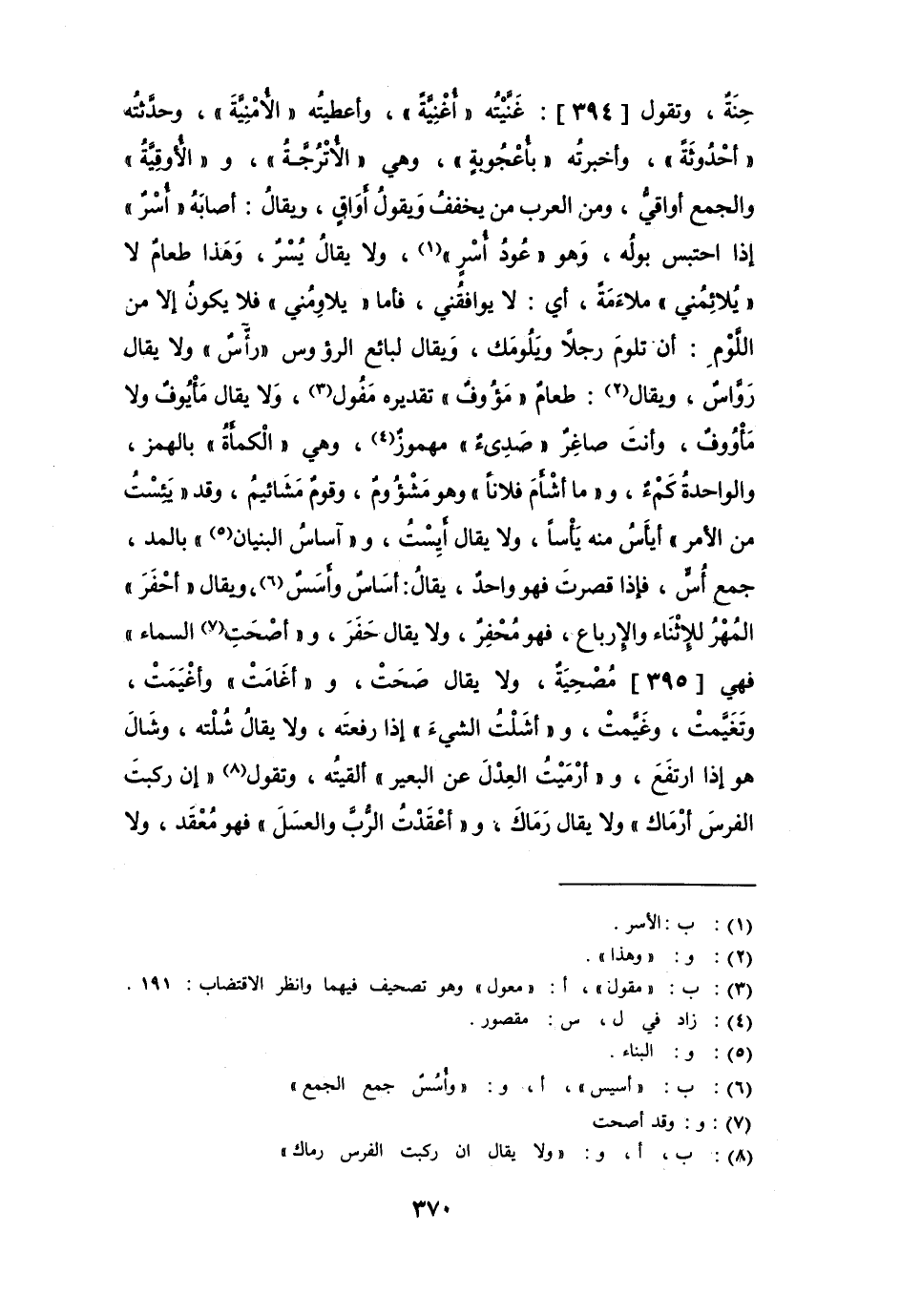 حِنَةٌ، وتقول: " غَنَّيته أغنيةً "، وأعطيته " الأُمنية "، وحدثته " أُحْدوثةً "، وأخبرته " بأعجوبة "، وهي " الأُتْرُجَّة "، و " الأوقية " والجمع أواقيّ، ومن العرب من يخفف ويقول أوَاقٍ، ويقال: أصابه " أُسْرٌ " إذا احتبس بوله، وهو " عوُد أُسْرٍ " ولا يقال يُسْر، وهذا طعام لا " يُلائمني " ملاءمةً، أي: لا يوافقني، فأما " يلاومني " فلا يكون إلا من اللوم: أن تلوم رجلاً ويلومك، ويقال لبائع الرؤوس " رآس " ولا يقال رواس، ويقال طعام " مَؤُوف " تقديره مَفُول، ولا يقال مأيوف ولا مأووف، وأنت صاغر " صَدِئ " مهموز مقصور، وهي " الكمأة " بالهمز، والواحدة كمءٌ، و " ما أشأمَ فلاناً " وهو مَشْؤُوم، وقوم مَشَائيم، وقد " يَئِسْت من الأمر " أيأس منه يأساً، ولا يقال أيِسْت، و " آساس البنيان " بالمد، جمع أس، فإذا قصرت فهو واحد، يقال: أساس وأُسُسٌ، ويقال " أحْفَرَ " المهر للاثناء والإرباع، فهو مُحفِر، ولا يقال حَفَرَ، و " أصْحَت السماء " فهي مُصحية، ولا يقال صَحَت، و " أغامت " وأغْيَمَت، وتَغَيَّمت، وغَيَّمت، و " أشلتُ الشيء " إذا رفعته، ولا يقال شُلْته، وشالَ هو إذا ارتفع، و " أرميتُ العِدل عن البعير " ألقيته، وتقول " إن ركبت الفرس أرْمَاكَ " ولا يقال رَمَاك، و " أعقدتُ الرُّبّ والعسل " فهو مُعْقَد، ولا