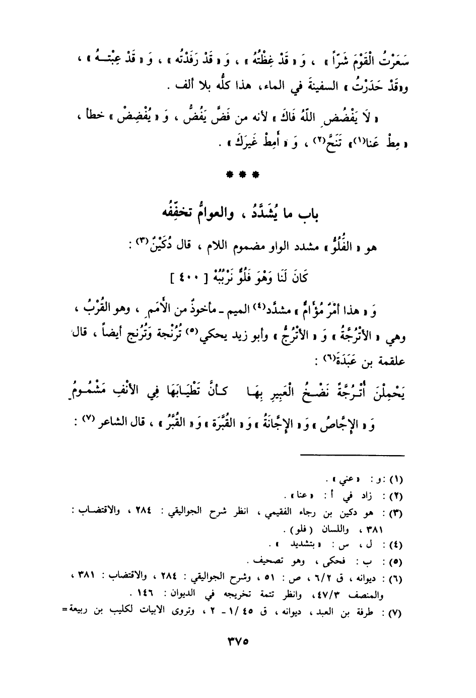 سَعَرْتَ القومَ شراً "، و " قد غِظْتُهُ "، و " قد رَفَدْته "، و " قد عِبْتُه "، و " قد حَدَرْتُ " السفينة في الماء، هذا كله بلا ألف.