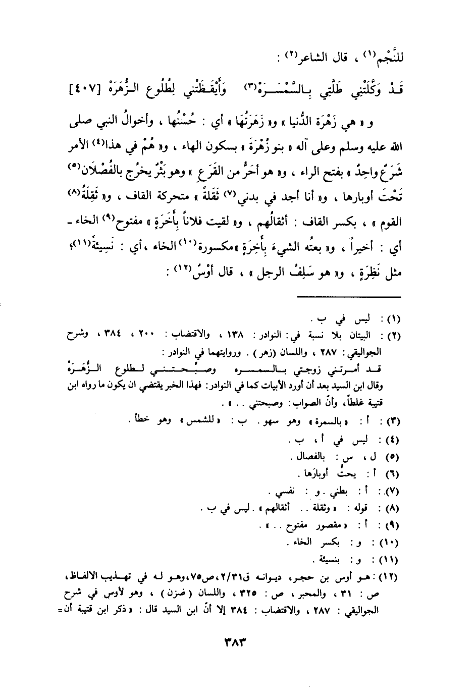 و" هي زَهْرَة الدنيا " و " زَهَرَتُها " أي: حسنها، وأخوال النبي صلى الله عليه وسلم وعلى آله " بنو زُهْرة " بسكون الهاء، و " هم في هذا الأمر شَرَعٌ واحدٌ " بفتح الراء، و " هو أحرُّ من القَرَع " و " هو بَثْرٌ يخرج بالفصال يحتُّ أوبارها، و " أنا أجد في بدني ثَقَلةً " متحركة القاف، و " ثَقِلَة القوم " - بكسر القاف - أثقالهم، و " لقيت فلاناً بأَخَرةٍ " - مفتوح الخاء - أي: أخيراً، و " بعته الشيء بأَخِرَةٍ " مكسورة الخاء - أي: نسيئةً؛ مثل نَظِرة، و " هو سَلِف الرجل " قال أوس: