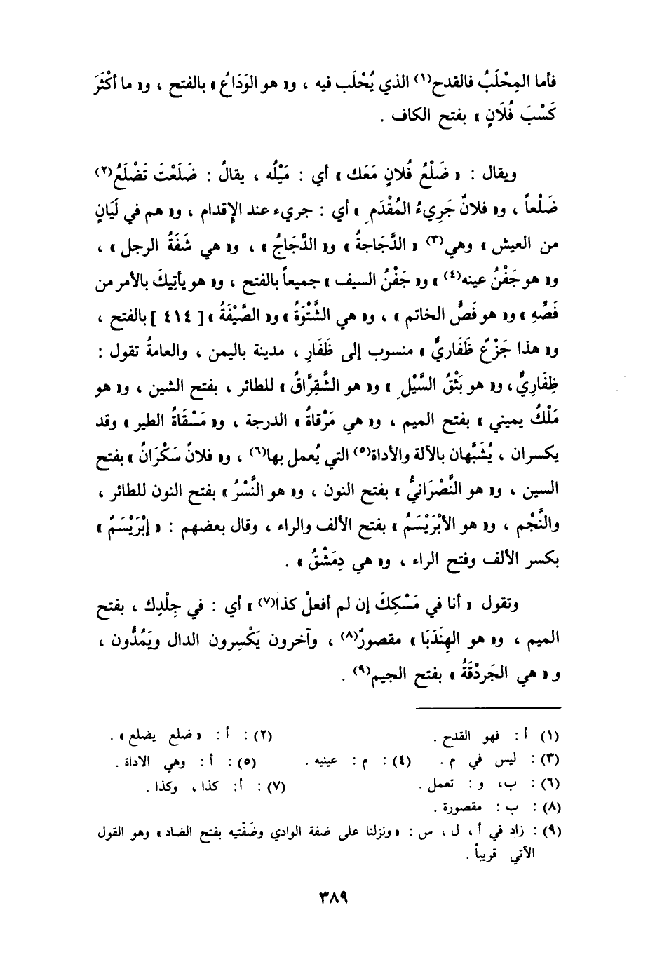 ويقال: " ضَلْعُ فلان معك " أي: مَيْله، يقال: ضَلَعْتَ تَضْلَعُ ضَلْعاً، " فلان جريء المُقْدَم " أي: جريء عند الإقدام، و " هم في لَيَانٍ من العيش " و " الدَّجاجة " و " الدَّجَاج "، و " هي شَفَةُ الرجل "، و " هو جَفْن عينيه " و " جَفْن السيف " جميعاً بالفتح، و " هو يأتيك بالأمر من فَصِّه " و " هو فَصُّ الخاتم "، و " هي الشَّتْوَة " و " الصَّيْفَة " بالفتح، و " هذا جَزْعٌ ظفاريٌ " منسوب إلى ظفار، مدينة باليمن، والعامة تقول: ظِفَاري، و " هو بَثْقُ السَّيل "، و " هو الشَّقِرَّاق " للطائر، بفتح الشين، و " هو مَلْكُ يميني " بفتح الميم، و " هي مَرقَاة " الدرجة، و " مَسْقاة الطير " وقد يكسران يُشَبَّهان بالآلة والأداة التي يعمل بها، و " فلان سَكْرَان " بفتح السين، و " هو النَّصْراني " بفتح النون، و " هو النَّسْر " بفتح النون للطائر، و " النَّجْمُ "، و " هو الأبْرَيْسَمُ " بفتح الألف والراء، وقال بعضهم " إبْرَيسم " بكسر الألف وفتح الراء، و " هي دِمَشْقُ ".