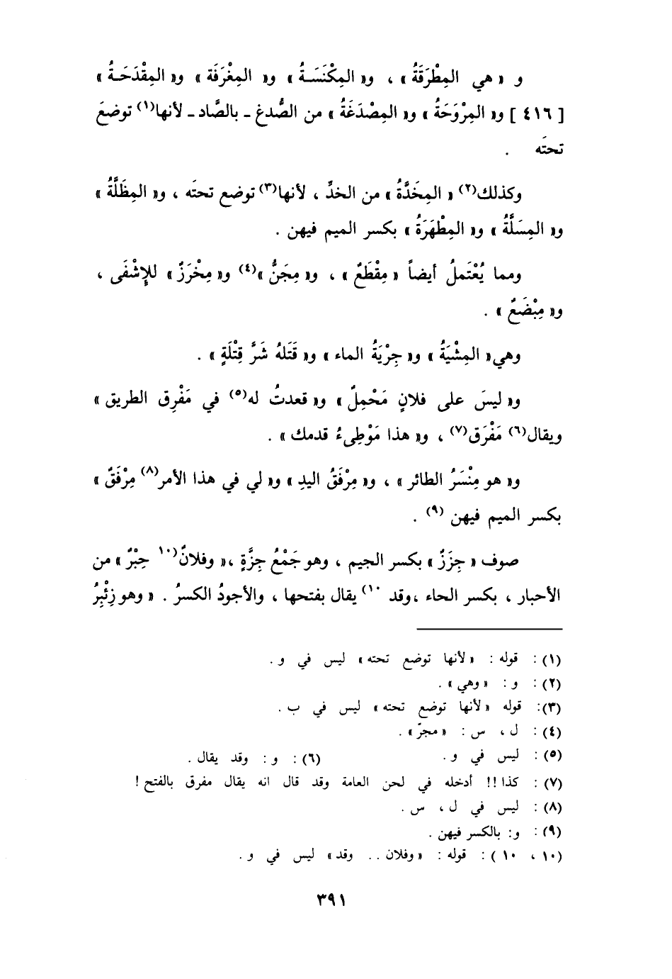 و" ليس على فلان مَحْمِل "، و " قعدت له في مَفْرِق الطريق " ويقال " مَفْرَق "، و " هذا مَوْطِئْ قدمك ".