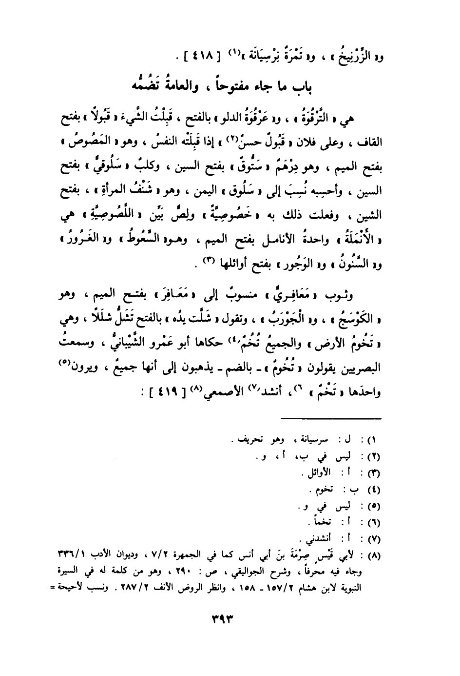 هي " التَّرْقُوَة "، و " عَرْقُوَة الدلو " بالفتح، قبلت الشيء " قَبُولا " بفتح القاف، وعلى فلان " قَبُولٌ حسنٌ " إذا قبلته النفس، و " هو المَصُوص " بفتح الميم، وهو درهم " سَتُّوق " بفتح السين، و " كلب سَلُوقيٌّ " بفتح السين، وأحسبه نسب إلى سَلُوق اليمن، و " هو شَنْفُ المرأة "، بفتح الشين، وفعلت ذلك به " خَصُوصيَّة " و " لصٌّ بيِّن اللَّصُوصِيَّة " و " هي الأنمَلَةُ " واحدة الأنامل بفتح الميم، و " هو السَّعُوط " و " الغَرُور " و " السَّنُون " و " الوَجُور " بفتح أوائلها.