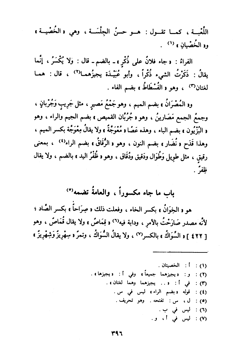 و" المُصْرَان " بضم الميم، وهو جمع مَصيرٍ، مثل جَريبٍ وجُرْبَان، وجمع الجمع مَصَارين، وهو " جُرُبَّان القميص " بضم الجيم والراء، وهو " البُزْيُون " بضم الباء، وهذه عصاً " مُعْوَجَّة " ولا يقال مِعْوَجَّة بكسر الميم، وهذا قدحٌ " نُضَار " بضم النون، وهو " الرُّقَاق " - بضم الراء - بمعنى رقيق، مثل طويل وطُوَال ودَقيق ودُقَاق، وهو " ظُفْرُ اليد " - بالضم - ولا يقال ظِفرٌ.