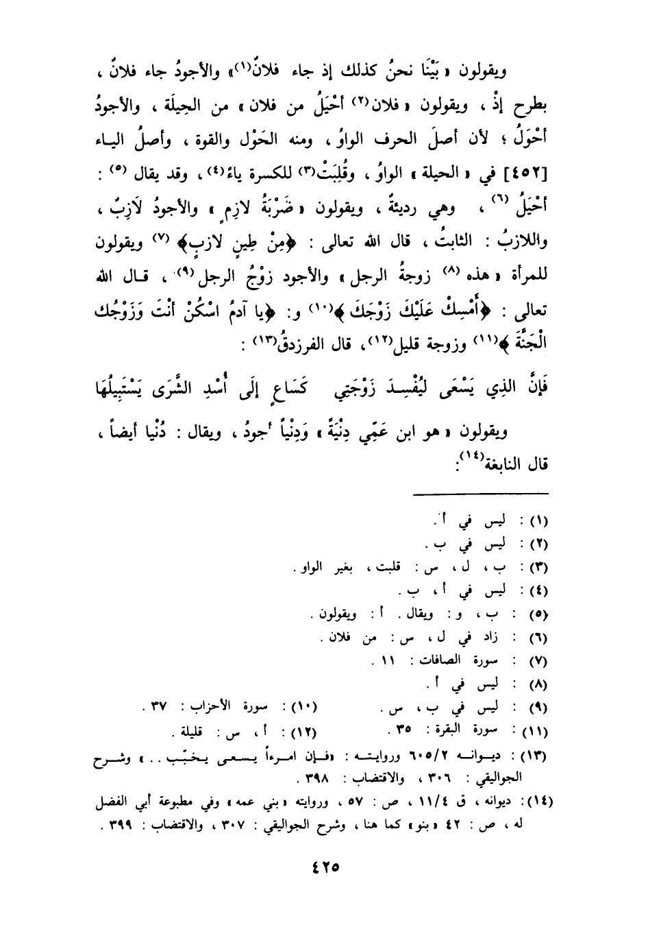 ويقولون " بَيْنا نحن كذلك إذ جاء فلان " والأجود جاء فلان، بطرح إذْ، ويقولون " فلان أحْيَل من فلان " من الحيلَة، والأجود أحْوَلُ؛ لأن أصل الحرف الواو، ومنه الحَوْل والقوة، وأصل الياء في الحيلة الواو، وقُلبت للكسرة ياءً، وقد يقال: أحْيَلُ من فلان، وهي رديئة، ويقولون " ضَرْبَةُ لازم " والأجود لازب واللازب: الثابتُ، قال الله تعالى:) منْ طين لازِبٍ (ويقولون للمرأة " هذه زوجة الرجل " والأجود زَوْجُ الرجل، قال الله تعالى:) أمْسِكَ عليكَ زَوْجَكَ (وقال عزّ وجلّ:) يا آدمُ اسْكُنْ أنتَ وزَوْجُك الجَنَّة (، وزوجة قليلة، قال الفرزدق: