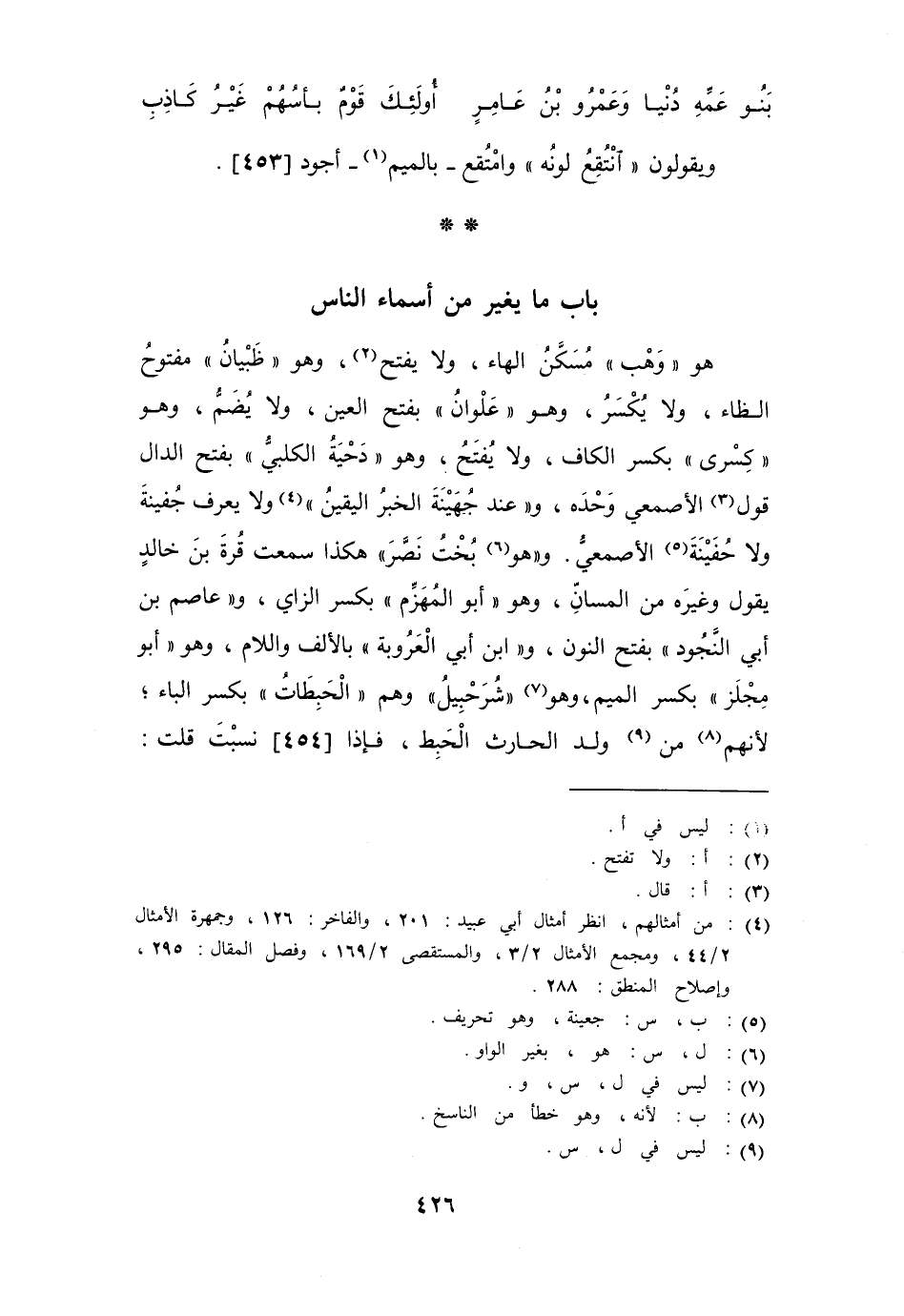 هو " وَهْب " مسكن الهاء، ولا يفتح، وهو " ظَبْيان " مفتوح الظاء، ولا يكسر، وهو " عَلْوان " بفتح العين، ولا يضم، وهو " كِسْرَى " بكسر الكاف، ولا يفتح، وهو " دَحْيَة الكلبي " بفتح الدال قول الأصمعي وَحْده، و " عند جُهَيْنَة الخبرُ اليقينُ " ولا يعرف جفينة ولا حُفَيْنَة.