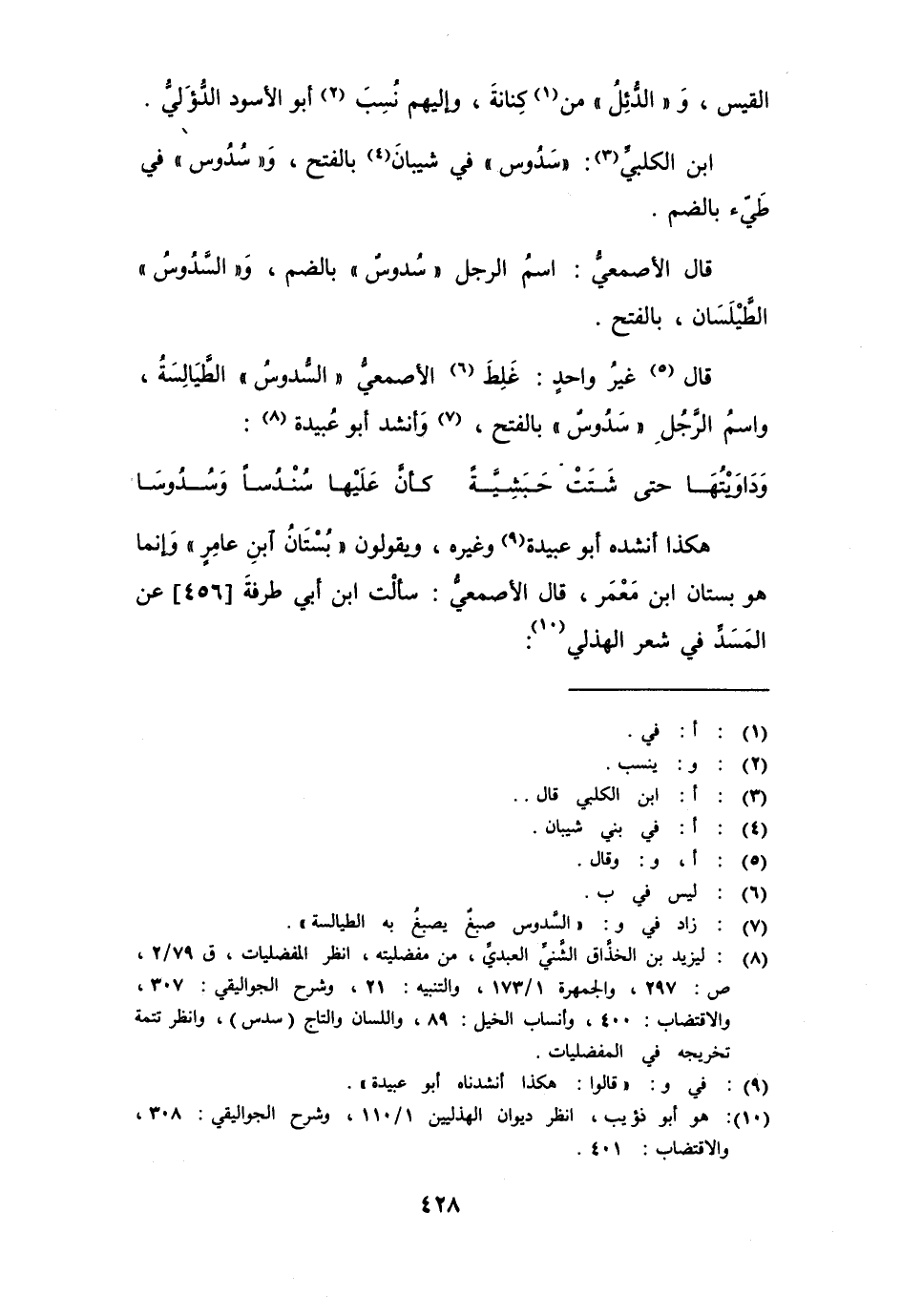 قال غير واحد غَلِطَ الأصمعي " السُّدوس " الطيالسة، اسم الرجل " سَدُوس " بالفتح، وأنشد أبو عُبيدة: