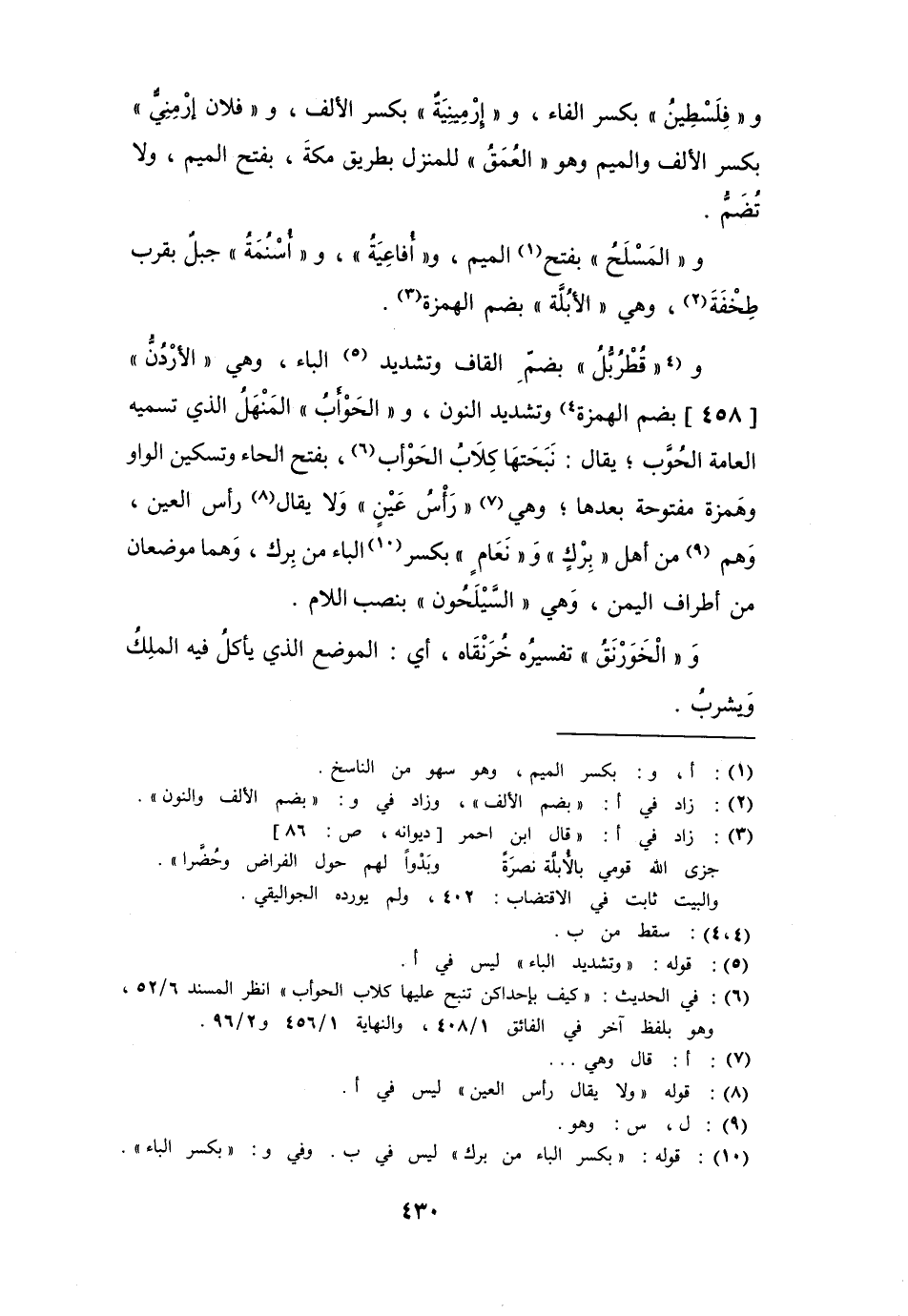 و" قُطْرُبُّلٌ " بضم القاف وتشديد الباء، وهي " الأُردنُّ " بضم الهمزة وتشديد النون، " والحَوْأَبُ " المنهل الذي تسميه العامة الحَوّب. يقال: نَبَحَتها كلاب الحَوأب - بفتح الحاء وتسكين الواو وهمزة مفتوحة بعدها - و " هي رَأْسُ عينٍ " ولا يقال رأس العين، وهو من أهل " بِرْك " و " نَعَامٍ " وهما موضعان من أطراف اليمن، وهي " السَّيْلَحون " بنصب اللام.