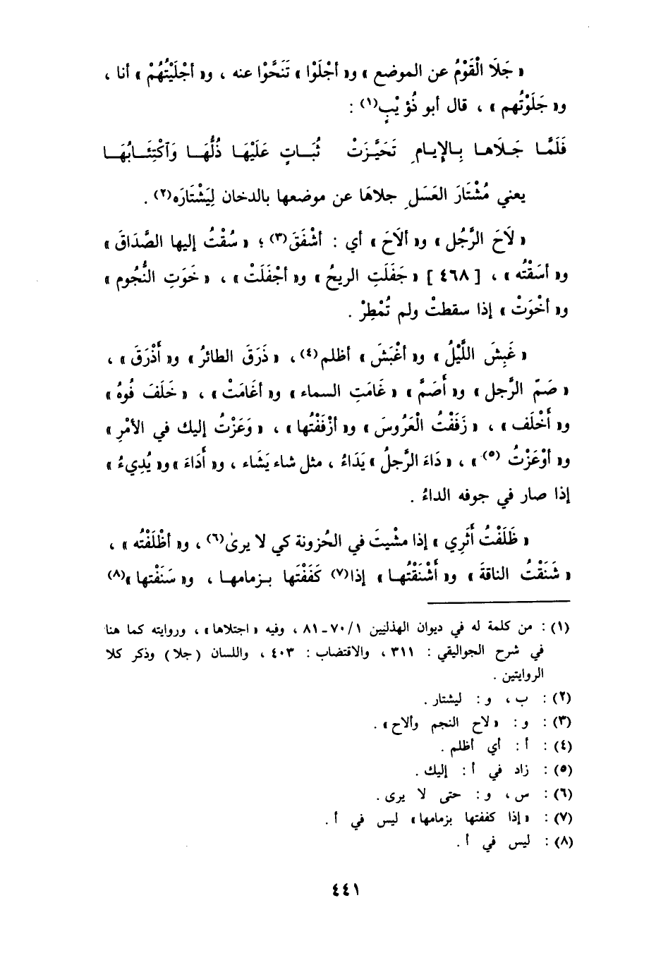" جَلاَ القوم عن الموضع " وأجْلَوْا " تنحَّوْا عنه، و " أَجَلْيُتُهم أنا "، و " جَلَوْتُهُم "، قال أبو ذؤيب: