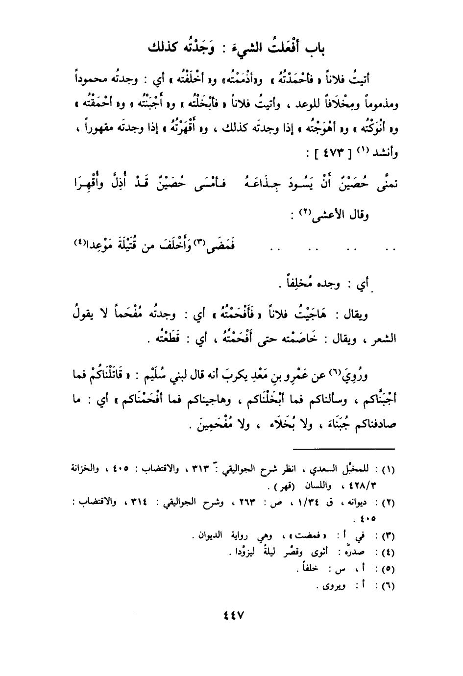أتيت فلاناً " فأحْمَدْتُهُ " و " أَذْمَمْتُه " و " أَخْلَفْتُه " أي: وجدته محموداً ومذموماً ومِخلافاً للوعد؛ وأتيت فلاناً " فأبْخَلْتُه " و " أَجْبَنْتُه " و " أَحْمَقْتُه " و " أَنْوَكْتُه " و " أَهْوَجْتُه " إذا وجدته كذلك، و " أَقْهَرْتُه " إذا وجدته مقهوراً، وأنشد: