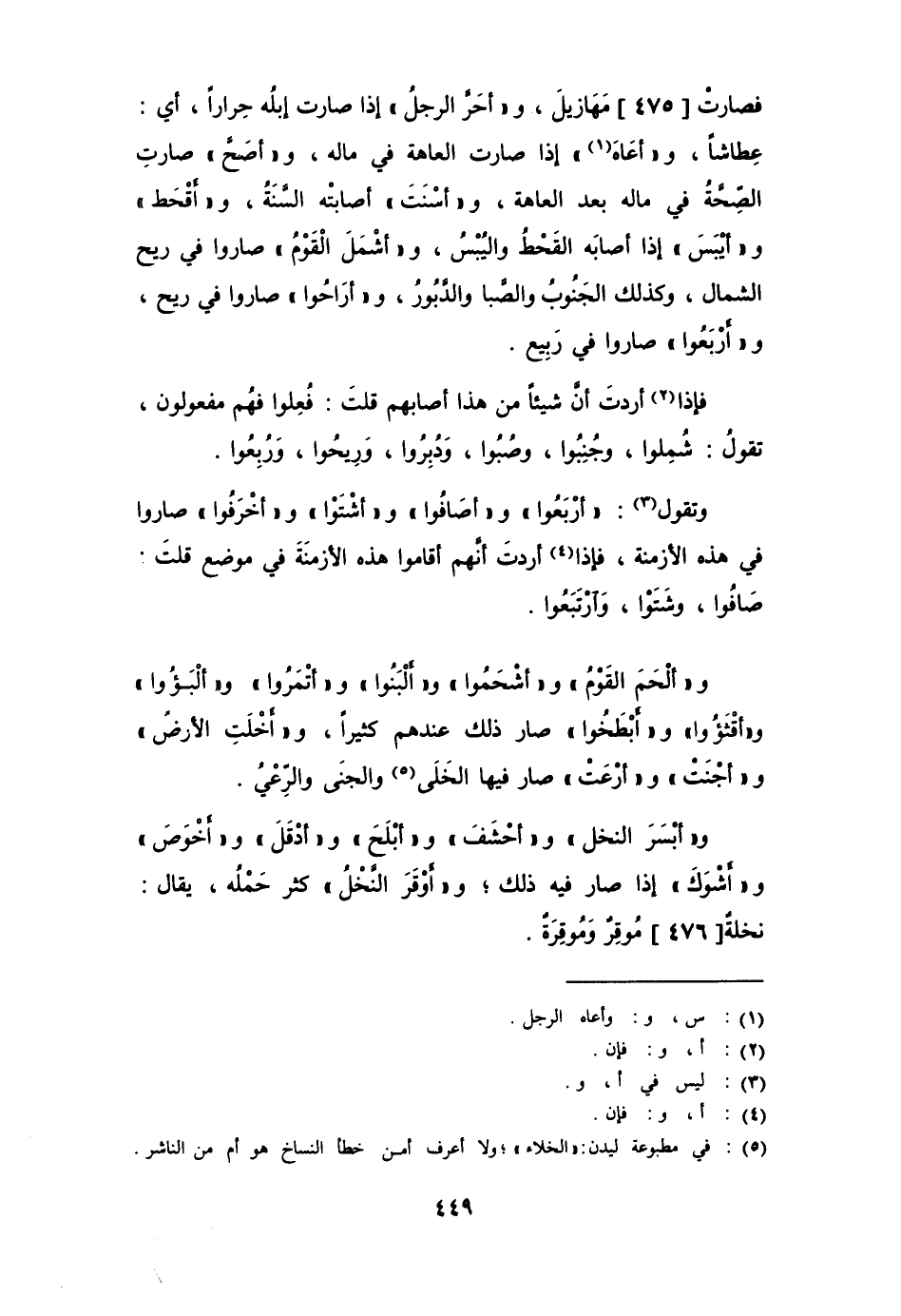 فصارت مهازيل، و " أحَرَّ الرجل " إذا صارت إبله حِراراً، أي: عطاشاً، و " أعَاهَ الرجل " إذا صارت العاهة في ماله، و " أصَحَّ " صارت الصحة في ماله بعد العاهة، و " أَسْنَتَ " أصابته السَّنة، و " أَقْحَطَ " و " أَيْبَسَ " إذا أصابه القحط واليبس، و " أَشْمَلَ القوم " صاروا في ريح الشمال، وكذلك الجَنوب والصَّبا والدَّبور، وأراحوا صاروا في ريح، و " أَرْبَعُوا " صاروا في ربيع.