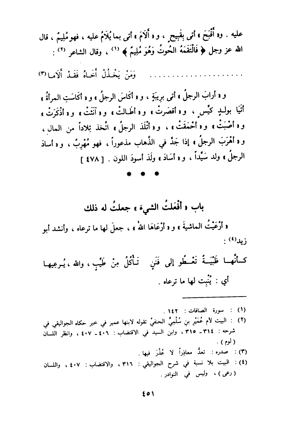 و" أرابَ " الرجل أتى بريبة، و " أَكَاسَ الرجل " و " أكاسَتِ المرأة " أتيا بولد كيِّس، و " أقصَرَت " و " أطَالَت " و " آنثَت " و " أذْكَرَت " و " أصْبَت " و " أحْمَقَت "، " أَتْلَدَ الرجل " اتَّخذ تِلاداً من المال، و " أَهْرَبَ الرجل " إذا جدَّ في الذَّهاب مذعوراً، فهو مُهربٌ، و " أَسادَ الرجل " ولد سيِّداً، و " أَسْوَدَ " و " أَسَاد " ولدَ أسود اللون.