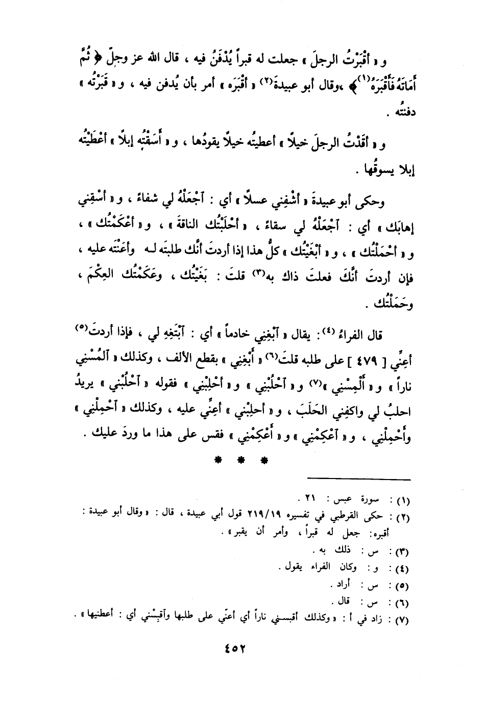 و " أَقْبَرْت الرجل " جعلت له قبراً يدفن فيه، قال الله عزّ وجلّ:) ثمَّ أمَاتَهُ فأقْبَرَهُ (، وقال أبو عبيدة " أقْبَرَه " أمر بأن يُدفن فيه، و " قبرته " دفنته.