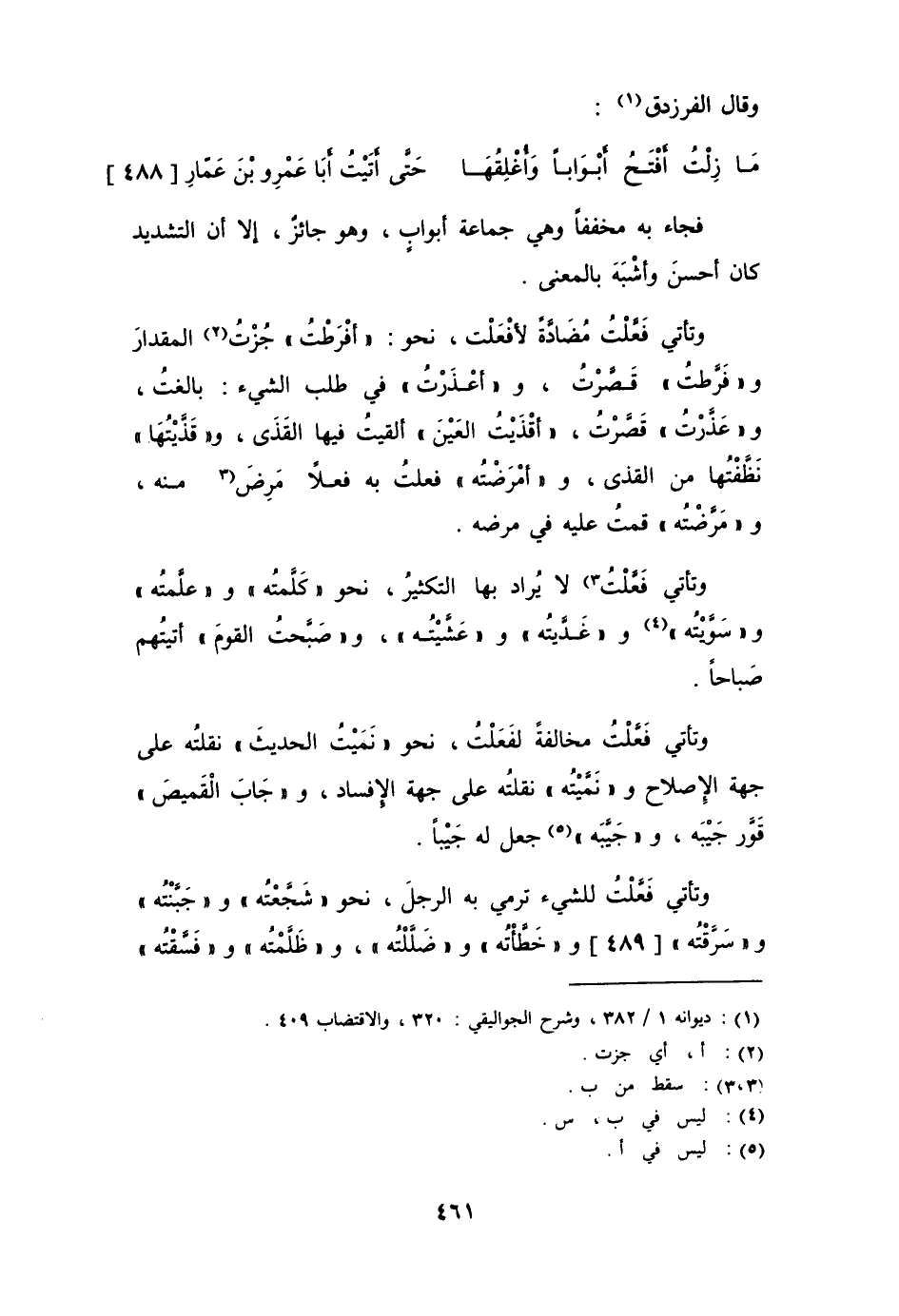 وتأتي فَعَّلْتُ مضادةً لأفْعَلْت، نحو: " أَفْرَطْتُ " جُزت المقدار و " فَرَّطْتُ " قَصَّرْتُ، و " أَعْذَرْتُ " في طلب الشيء: بالغت، و " عَذَرْتُ " قَصَّرْتُ، " أَقْذَيْتُ العين " ألقيت فيها القَذَى، و " قَذَّيْتُها " نظفتها من القذى، و " أَمْرَضْتُه " فعلت به فعلاً مرض منه، و " مَرَّضْتُه " قمت عليه في مرضه.