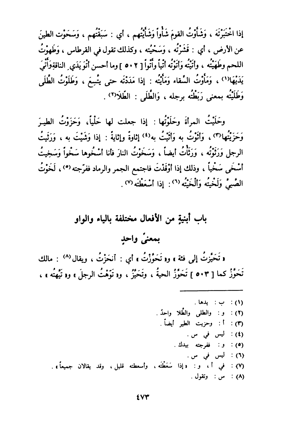إذا اخْتَبَرْته، وشَأَوْتُ القوم شَأْواً وشَأَيْتُهم، أي: سَبَقْتهم، وسَحَوْت الطين عن الأرض، أي: قَشَرْته، وسَحَيْته، وكذلك تقول في القرطاس، وطَهَوْت اللحم وطَهَيْتُه، وأَتَيْتُه وأَتَوْتُه أتياً وأتْواً وما أحسن أتْوَ يَدَيِ الناقة وأَتْيَ يَدَيْها، ومَأَوْتُ السِّقاء ومَأَيْته: إذا مَدَدْته حتى يتسع، وطَلَوْتُ الطَلَى وطَلَيْته بمعنى رَبَطْته برحله، والطَّلَى والطَّلا واحد.