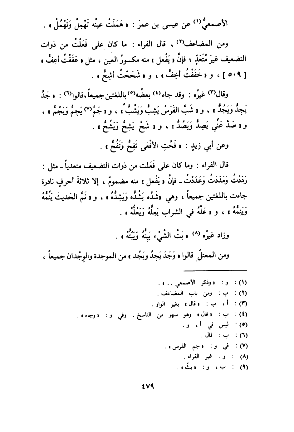 قال الفراء: وما كان على فَعَلت من ذوات التضعيف متعدياً - مثل: رَدَدْت ومَدَدْت وعَدَدْت - فإن يَفْعل منه مضموم، إلا ثلاثة أحرف نادرة جاءت باللغتين جميعاً، وهي " شَدَّه يشُدُّه ويشِدُّه "، و " نمَّ الحديثَ ينُمُّه وينِمُّه "، و " عَلِّه في الشراب يعِلُّه ويعُلُّه ".